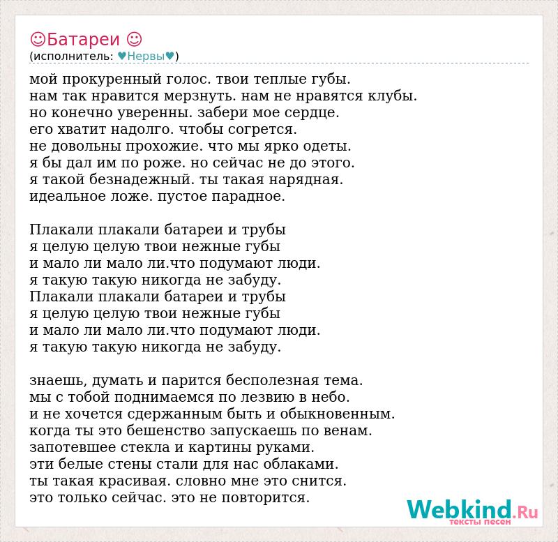 мой прокуренный голос. твои теплые губы. нам так нравится мерзнуть. нам не нравятся клубы. но конечно уверенны. забери мое сердце. его хватит надолго. чтобы согрется. не довольны прохожие. что мы ярко одеты. я бы дал им по роже. но сейчас не до этого. я такой безнадежный. ты такая нарядная. идеальное ложе. пустое парадное. Плакали плакали батареи и трубы я целую целую твои нежные губы и мало ли мало ли.что подумают люди. я такую такую никогда не забуду. Плакали плакали батареи и трубы я целую целую твои нежные губы и мало ли мало ли.что подумают люди. я такую такую никогда не забуду. знаешь, думать и парится бесполезная тема. мы с тобой поднимаемся по лезвию в небо. и не хочется сдержанным быть и обыкновенным. когда ты это бешенство запускаешь по венам. запотевшее стекла и картины руками. эти белые стены стали для нас облаками. ты такая красивая. словно мне это снится. это только сейчас. это не повторится.