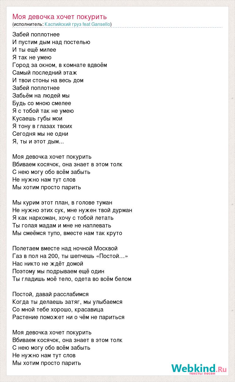 Забей поплотнее И пустим дым над постелью И ты ещё милее Я так не умею Город за окном, в комнате вдвоём Самый последний этаж И твои стоны на весь дом Забей поплотнее Забьём на людей мы Будь со мною смелее Я с тобой так не умею Кусаешь губы мои Я тону в глазах твоих Сегодня мы не одни Я, ты и этот дым... Моя девочка хочет покурить Вбиваем косячок, она знает в этом толк С нею могу обо всём забыть Не нужно нам тут слов Мы хотим просто парить Мы курим этот план, в голове туман Не нужно этих сук, мне нужен твой дурман Я как наркоман, хочу с тобой летать Ты голая мадам и мне не наплевать Мы смеёмся тупо, вместе нам так круто Полетаем вместе над ночной Москвой Газ в пол на 200, ты шепчешь «Постой…» Нас никто не ждёт домой Поэтому мы подрываем ещё один Ты гладишь моё тело, одета во всём белом Постой, давай расслабимся Когда ты делаешь затяг, мы улыбаемся Со мной тебе хорошо, красавица Растение поможет ни о чём не париться Моя девочка хочет покурить Вбиваем косячок, она знает в этом толк С нею могу обо всём забыть Не нужно нам тут слов Мы хотим просто парить