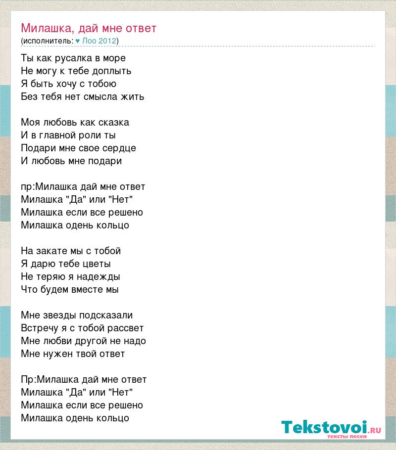 Ты как русалка в море Не могу к тебе доплыть Я быть хочу с тобою Без тебя нет смысла жить Моя любовь как сказка И в главной роли ты Подари мне свое сердце И любовь мне подари пр:Милашка дай мне ответ Милашка "Да" или "Нет" Милашка если все решено Милашка одень кольцо На закате мы с тобой Я дарю тебе цветы Не теряю я надежды Что будем вместе мы Мне звезды подсказали Встречу я с тобой рассвет Мне любви другой не надо Мне нужен твой ответ Пр:Милашка дай мне ответ Милашка "Да" или "Нет" Милашка если все решено Милашка одень кольцо