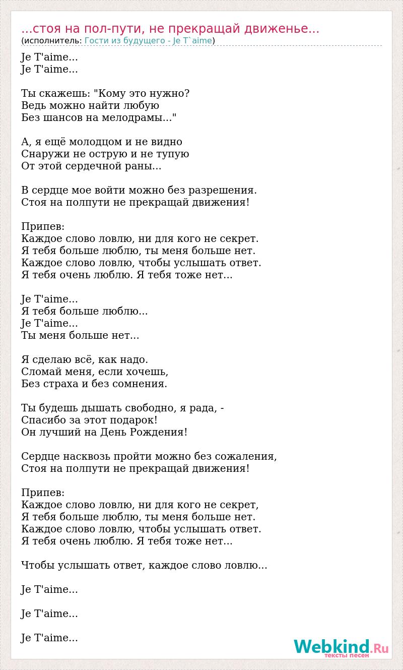 Je T'aime... Je T'aime... Ты скажешь: "Кому это нужно? Ведь можно найти любую Без шансов на мелодрамы..." А, я ещё молодцом и не видно Снаружи не острую и не тупую От этой сердечной раны... В сердце мое войти можно без разрешения. Стоя на полпути не прекращай движения! Припев: Каждое слово ловлю, ни для кого не секрет. Я тебя больше люблю, ты меня больше нет. Каждое слово ловлю, чтобы услышать ответ. Я тебя очень люблю. Я тебя тоже нет... Je T'aime... Я тебя больше люблю... Je T'aime... Ты меня больше нет... Я сделаю всё, как надо. Сломай меня, если хочешь, Без страха и без сомнения. Ты будешь дышать свободно, я рада, - Спасибо за этот подарок! Он лучший на День Рождения! Сердце насквозь пройти можно без сожаления, Стоя на полпути не прекращай движения! Припев: Каждое слово ловлю, ни для кого не секрет, Я тебя больше люблю, ты меня больше нет. Каждое слово ловлю, чтобы услышать ответ. Я тебя очень люблю. Я тебя тоже нет... Чтобы услышать ответ, каждое слово ловлю... Je T'aime... Je T'aime... Je T'aime...