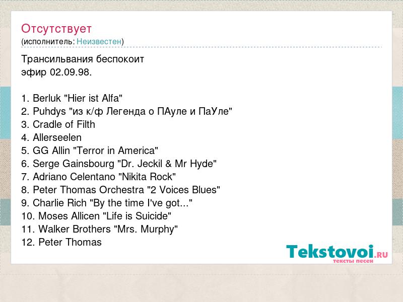 Трансильвания беспокоит эфир 02.09.98. 1. Berluk "Hier ist Alfa" 2. Puhdys "из к/ф Легенда о ПАуле и ПаУле" 3. Cradle of Filth 4. Allerseelen 5. GG Allin "Terror in America" 6. Serge Gainsbourg "Dr. Jeckil & Mr Hyde" 7. Adriano Celentano "Nikita Rock" 8. Peter Thomas Orchestra "2 Voices Blues" 9. Charlie Rich "By the time I've got..." 10. Moses Allicen "Life is Suicide" 11. Walker Brothers "Mrs. Murphy" 12. Peter Thomas