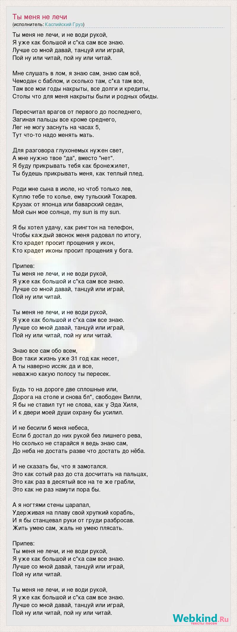 Ты меня не лечи, и не води рукой, Я уже как большой и с*ка сам все знаю. Лучше со мной давай, танцуй или играй, Пой ну или читай, пой ну или читай. Мне слушать в лом, я знаю сам, знаю сам всё, Чемодан с баблом, и сколько там, с*ка там все, Там все мои годы накрыты, все долги и кредиты, Столы что для меня накрыты были и родных обиды. Пересчитал врагов от первого до последнего, Загиная пальцы все кроме среднего, Лег не могу заснуть на часах 5, Тут что-то надо менять мать. Для разговора глухонемых нужен свет, А мне нужно твое "да", вместо "нет". Я буду прикрывать тебя как бронежилет, Ты будешь прикрывать меня, как теплый плед. Роди мне сына в июле, но чтоб только лев, Куплю тебе то колье, ему тульский Токарев. Крузак от японца или баварский седан, Мой сын мое солнце, my sun is my sun. Я бы хотел удачу, как рингтон на телефон, Чтобы каждый звонок меня радовал по итогу, Кто крадет просит прощения у икон, Кто крадет иконы просит прощения у бога. Припев: Ты меня не лечи, и не води рукой, Я уже как большой и с*ка сам все знаю. Лучше со мной давай, танцуй или играй, Пой ну или читай. Ты меня не лечи, и не води рукой, Я уже как большой и с*ка сам все знаю. Лучше со мной давай, танцуй или играй, Пой ну или читай, пой ну или читай. Знаю все сам обо всем, Все таки жизнь уже 31 год как несет, А ты наверно иссяк да и все, неважно какую полосу ты пересек. Будь то на дороге две сплошные или, Дорога на столе и снова бл*, свободен Вилли, Я бы не ставил тут не слова, как у Эда Хиля, И к двери моей души охрану бы усилил. И не бесили б меня небеса, Если б достал до них рукой без лишнего рева, Но сколько не старайся я ведь знаю сам, До неба не достать разве что достать до нёба. И не сказать бы, что я замотался. Это как сотый раз до ста досчитать на пальцах, Это как раз в десятый все на те же грабли, Это как не раз намути пора бы. А я ногтями стены царапал, Удерживая на плаву свой хрупкий корабль, И я бы станцевал руки от груди разбросав. Жить умею сам, жаль не умею плясать. Припев: Ты меня не лечи, и не води рукой, Я уже как большой и с*ка сам все знаю. Лучше со мной давай, танцуй или играй, Пой ну или читай. Ты меня не лечи, и не води рукой, Я уже как большой и с*ка сам все знаю. Лучше со мной давай, танцуй или играй, Пой ну или читай, пой ну или читай.