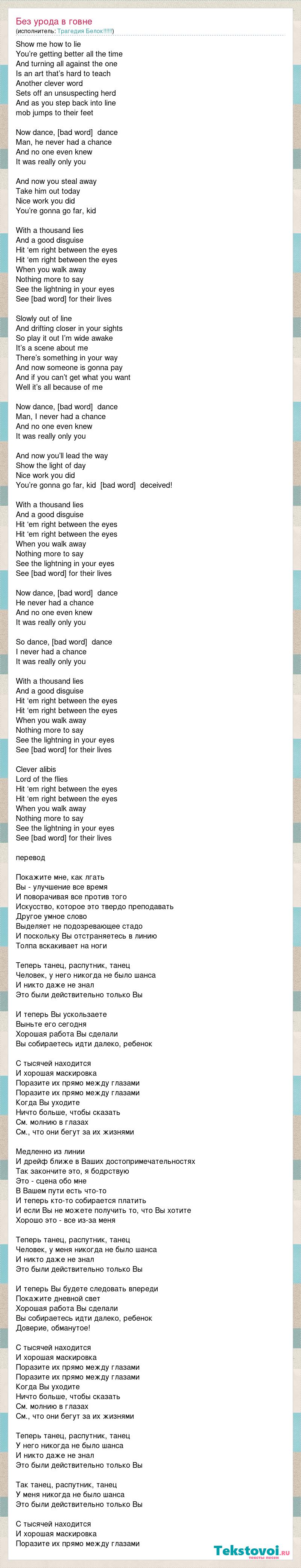 Show me how to lie You’re getting better all the time And turning all against the one Is an art that’s hard to teach Another clever word Sets off an unsuspecting herd And as you step back into line mob jumps to their feet Now dance, [bad word] dance Man, he never had a chance And no one even knew It was really only you And now you steal away Take him out today Nice work you did You’re gonna go far, kid With a thousand lies And a good disguise Hit ‘em right between the eyes Hit ‘em right between the eyes When you walk away Nothing more to say See the lightning in your eyes See ‘em running for their lives Slowly out of line And drifting closer in your sights So play it out I’m wide awake It’s a scene about me There’s something in your way And now someone is gonna pay And if you can’t get what you want Well it’s all because of me Now dance, [bad word] dance Man, I never had a chance And no one even knew It was really only you And now you’ll lead the way Show the light of day Nice work you did You’re gonna go far, kid Trust, deceived! With a thousand lies And a good disguise Hit ‘em right between the eyes Hit ‘em right between the eyes When you walk away Nothing more to say See the lightning in your eyes See ‘em running for their lives Now dance, [bad word] dance He never had a chance And no one even knew It was really only you So dance, [bad word] dance I never had a chance It was really only you With a thousand lies And a good disguise Hit ‘em right between the eyes Hit ‘em right between the eyes When you walk away Nothing more to say See the lightning in your eyes See ‘em running for their lives Clever alibis Lord of the flies Hit ‘em right between the eyes Hit ‘em right between the eyes When you walk away Nothing more to say See the lightning in your eyes See ‘em running for their lives перевод Покажите мне, как лгать Вы - улучшение все время И поворачивая все против того Искусство, которое это твердо преподавать Другое умное слово Выделяет не подозревающее стадо И поскольку Вы отстраняетесь в линию Толпа вскакивает на ноги Теперь танец, распутник, танец Человек, у него никогда не было шанса И никто даже не знал Это были действительно только Вы И теперь Вы ускользаете Выньте его сегодня Хорошая работа Вы сделали Вы собираетесь идти далеко, ребенок С тысячей находится И хорошая маскировка Поразите их прямо между глазами Поразите их прямо между глазами Когда Вы уходите Ничто больше, чтобы сказать См. молнию в глазах См., что они бегут за их жизнями Медленно из линии И дрейф ближе в Ваших достопримечательностях Так закончите это, я бодрствую Это - сцена обо мне В Вашем пути есть что-то И теперь кто-то собирается платить И если Вы не можете получить то, что Вы хотите Хорошо это - все из-за меня Теперь танец, распутник, танец Человек, у меня никогда не было шанса И никто даже не знал Это были действительно только Вы И теперь Вы будете следовать впереди Покажите дневной свет Хорошая работа Вы сделали Вы собираетесь идти далеко, ребенок Доверие, обманутое! С тысячей находится И хорошая маскировка Поразите их прямо между глазами Поразите их прямо между глазами Когда Вы уходите Ничто больше, чтобы сказать См. молнию в глазах См., что они бегут за их жизнями Теперь танец, распутник, танец У него никогда не было шанса И никто даже не знал Это были действительно только Вы Так танец, распутник, танец У меня никогда не было шанса Это были действительно только Вы С тысячей находится И хорошая маскировка Поразите их прямо между глазами