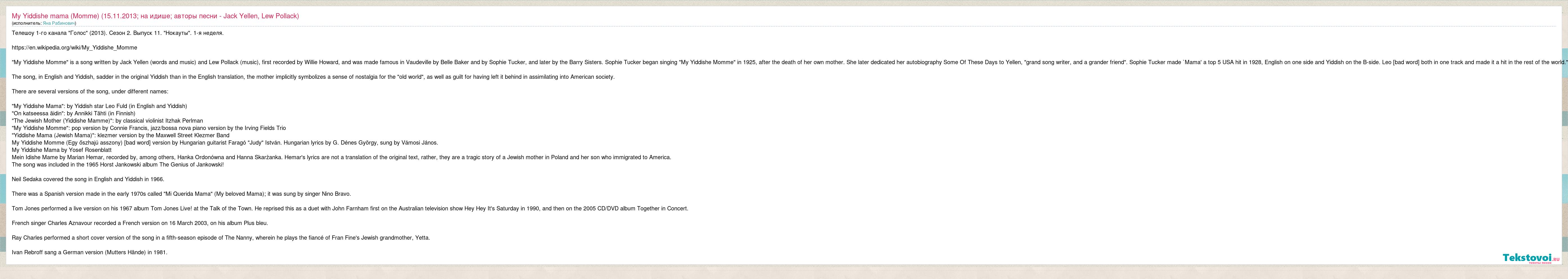 Телешоу 1-го канала "Голос" (2013). Сезон 2. Выпуск 11. "Нокауты". 1-я неделя. https://en.wikipedia.org/wiki/My_Yiddishe_Momme "My Yiddishe Momme" is a song written by Jack Yellen (words and music) and Lew Pollack (music), first recorded by Willie Howard, and was made famous in Vaudeville by Belle Baker and by Sophie Tucker, and later by the Barry Sisters. Sophie Tucker began singing "My Yiddishe Momme" in 1925, after the death of her own mother. She later dedicated her autobiography Some Of These Days to Yellen, "grand song writer, and a grander friend". Sophie Tucker made `Mama' a top 5 USA hit in 1928, English on one side and Yiddish on the B-side. Leo [bad word] both in one track and made it a hit in the rest of the world." The song, in English and Yiddish, sadder in the original Yiddish than in the English translation, the mother implicitly symbolizes a sense of nostalgia for the "old world", as well as guilt for having left it behind in assimilating into American society. There are several versions of the song, under different names: "My Yiddishe Mama": by Yiddish star Leo Fuld (in English and Yiddish) "On katseessa äidin": by Annikki Tähti (in Finnish) "The Jewish Mother (Yiddishe Mamme)": by classical violinist Itzhak Perlman "My Yiddishe Momme": pop version by Connie Francis, jazz/bossa nova piano version by the Irving Fields Trio "Yiddishe Mama (Jewish Mama)": klezmer version by the Maxwell Street Klezmer Band My Yiddishe Momme (Egy őszhajú asszony) [bad word] version by Hungarian guitarist Faragó "Judy" István. Hungarian lyrics by G. Dénes György, sung by Vámosi János. My Yiddishe Mama by Yosef Rosenblatt Mein Idishe Mame by Marian Hemar, recorded by, among others, Hanka Ordonówna and Hanna Skarżanka. Hemar's lyrics are not a translation of the original text, rather, they are a tragic story of a Jewish mother in Poland and her son who immigrated to America. The song was included in the 1965 Horst Jankowski album The Genius of Jankowski! Neil Sedaka covered the song in English and Yiddish in 1966. There was a Spanish version made in the early 1970s called "Mi Querida Mama" (My beloved Mama); it was sung by singer Nino Bravo. Tom Jones performed a live version on his 1967 album Tom Jones Live! at the Talk of the Town. He reprised this as a duet with John Farnham first on the Australian television show Hey Hey It's Saturday in 1990, and then on the 2005 CD/DVD album Together in Concert. French singer Charles Aznavour recorded a French version on 16 March 2003, on his album Plus bleu. Ray Charles performed a short cover version of the song in a fifth-season episode of The Nanny, wherein he plays the fiancé of Fran Fine's Jewish grandmother, Yetta. Ivan Rebroff sang a German version (Mutters Hände) in 1981.