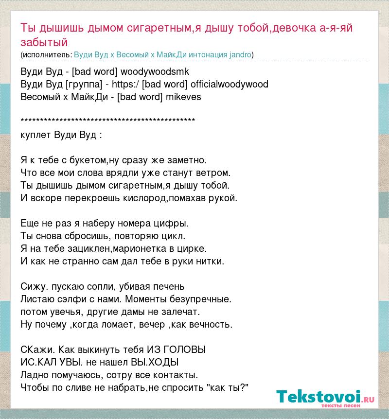Вуди Вуд - [bad word] woodywoodsmk Вуди Вуд [группа] - https:/ [bad word] officialwoodywood Весомый x МайкДи - [bad word] mikeves ********************************************* куплет Вуди Вуд : Я к тебе с букетом,ну сразу же заметно. Что все мои слова врядли уже станут ветром. Ты дышишь дымом сигаретным,я дышу тобой. И вскоре перекроешь кислород,помахав рукой. Еще не раз я наберу номера цифры. Ты снова сбросишь, повторяю цикл. Я на тебе зациклен,марионетка в цирке. И как не странно сам дал тебе в руки нитки. Сижу. пускаю сопли, убивая печень Листаю сэлфи с нами. Моменты безупречные. потом увечья, другие дамы не залечат. Ну почему ,когда ломает, вечер ,как вечность. СКажи. Как выкинуть тебя ИЗ ГОЛОВЫ ИС.КАЛ УВЫ. не нашел ВЫ.ХОДЫ Ладно помучаюсь, сотру все контакты. Чтобы по сливе не набрать,не спросить "как ты?"