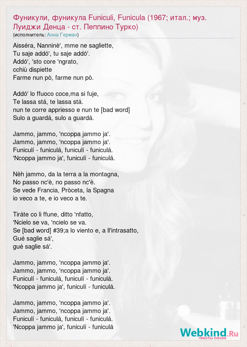 Главная→Исполнители→Анна Герман→Фуникули, фуникула Funiculi, Funicula (1967; итал.; муз. Луиджи Денца -