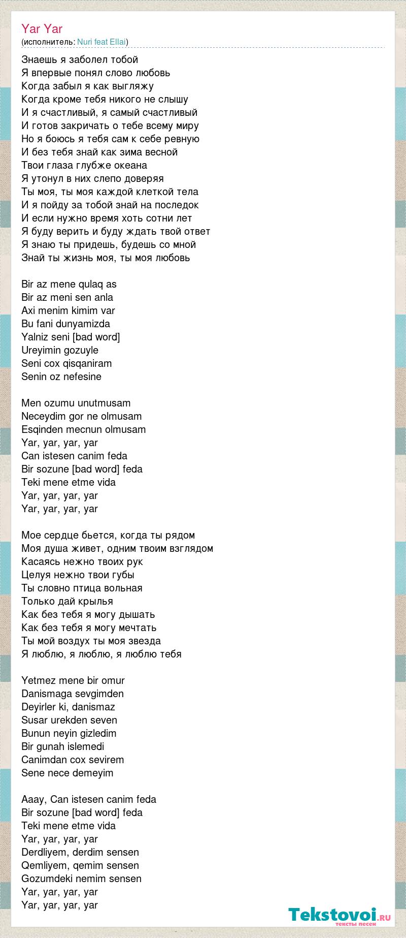 Знаешь я заболел тобой Я впервые понял слово любовь Когда забыл я как выгляжу Когда кроме тебя никого не слышу И я счастливый, я самый счастливый И готов закричать о тебе всему миру Но я боюсь я тебя сам к себе ревную И без тебя знай как зима весной Твои глаза глубже океана Я утонул в них слепо доверяя Ты моя, ты моя каждой клеткой тела И я пойду за тобой знай на последок И если нужно время хоть сотни лет Я буду верить и буду ждать твой ответ Я знаю ты придешь, будешь со мной Знай ты жизнь моя, ты моя любовь Bir az mene qulaq as Bir az meni sen anla Axi menim kimim var Bu fani dunyamizda Yalniz seni [bad word] Ureyimin gozuyle Seni cox qisqaniram Senin oz nefesine Men ozumu unutmusam Neceydim gor ne olmusam Esqinden mecnun olmusam Yar, yar, yar, yar Can istesen canim feda Bir sozune [bad word] feda Teki mene etme vida Yar, yar, yar, yar Yar, yar, yar, yar Мое сердце бьется, когда ты рядом Моя душа живет, одним твоим взглядом Касаясь нежно твоих рук Целуя нежно твои губы Ты словно птица вольная Только дай крылья Как без тебя я могу дышать Как без тебя я могу мечтать Ты мой воздух ты моя звезда Я люблю, я люблю, я люблю тебя Yetmez mene bir omur Danismaga sevgimden Deyirler ki, danismaz Susar urekden seven Bunun neyin gizledim Bir gunah islemedi Canimdan cox sevirem Sene nece demeyim Aaay, Can istesen canim feda Bir sozune [bad word] feda Teki mene etme vida Yar, yar, yar, yar Derdliyem, derdim sensen Qemliyem, qemim sensen Gozumdeki nemim sensen Yar, yar, yar, yar Yar, yar, yar, yar