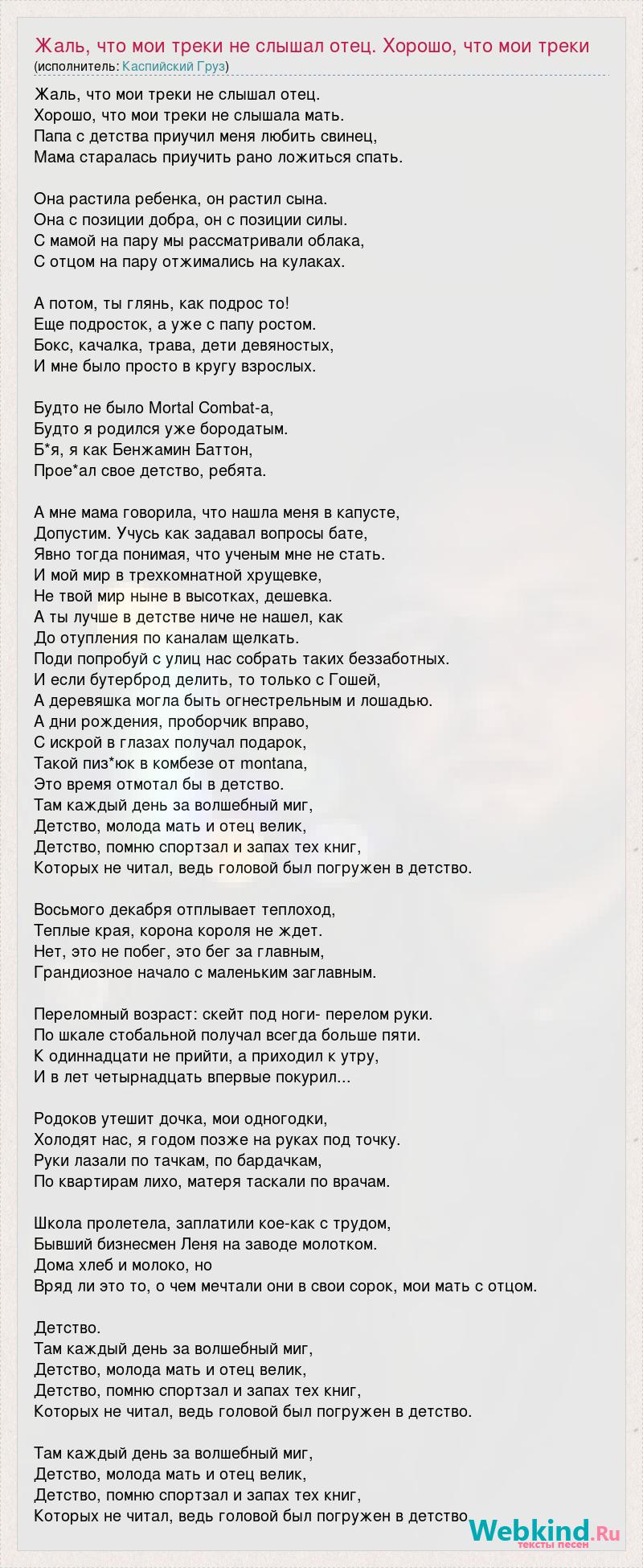 Главная→Исполнители→Каспийский Груз→Жаль, что мои треки не слышал отец. Хорошо, что мои треки не слышала мать. П