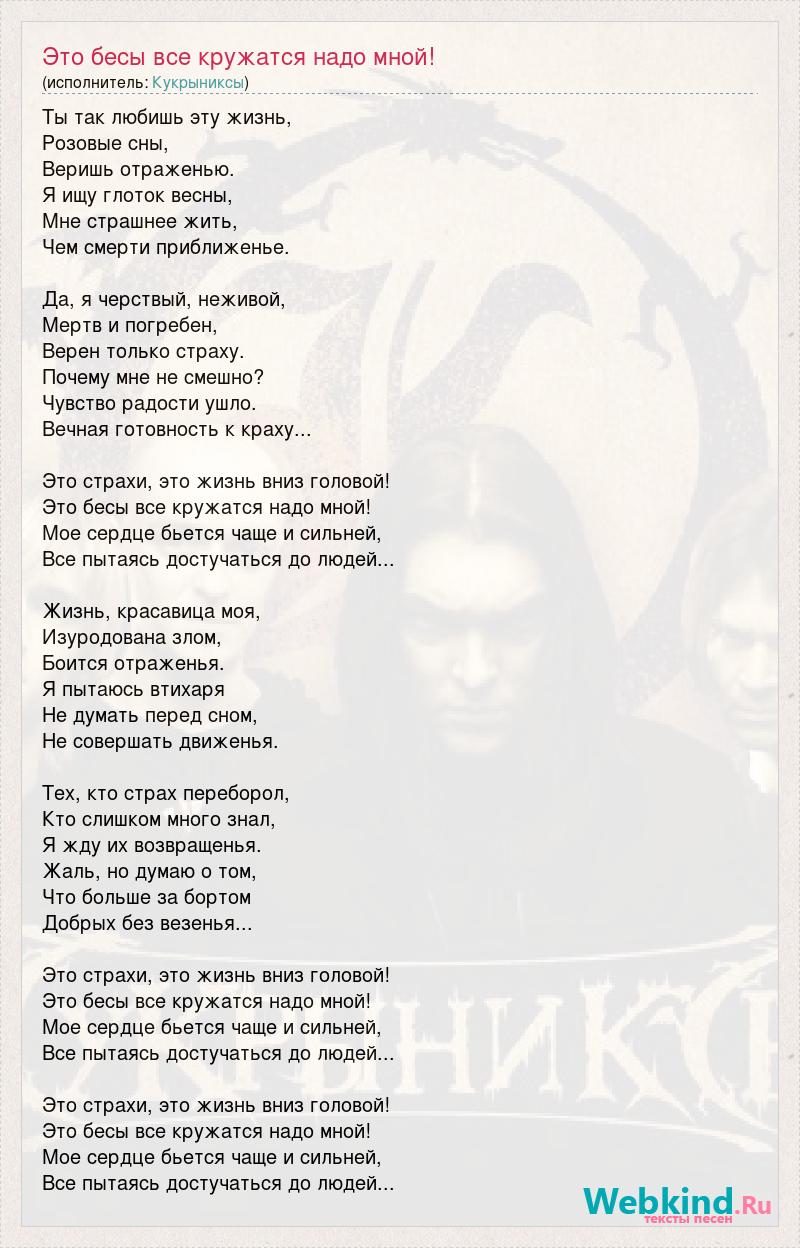Ты так любишь эту жизнь, Розовые сны, Веришь отраженью. Я ищу глоток весны, Мне страшнее жить, Чем смерти приближенье. Да, я черствый, неживой, Мертв и погребен, Верен только страху. Почему мне не смешно? Чувство радости ушло. Вечная готовность к краху... Это страхи, это жизнь вниз головой! Это бесы все кружатся надо мной! Мое сердце бьется чаще и сильней, Все пытаясь достучаться до людей... Жизнь, красавица моя, Изуродована злом, Боится отраженья. Я пытаюсь втихаря Не думать перед сном, Не совершать движенья. Тех, кто страх переборол, Кто слишком много знал, Я жду их возвращенья. Жаль, но думаю о том, Что больше за бортом Добрых без везенья... Это страхи, это жизнь вниз головой! Это бесы все кружатся надо мной! Мое сердце бьется чаще и сильней, Все пытаясь достучаться до людей... Это страхи, это жизнь вниз головой! Это бесы все кружатся надо мной! Мое сердце бьется чаще и сильней, Все пытаясь достучаться до людей...
