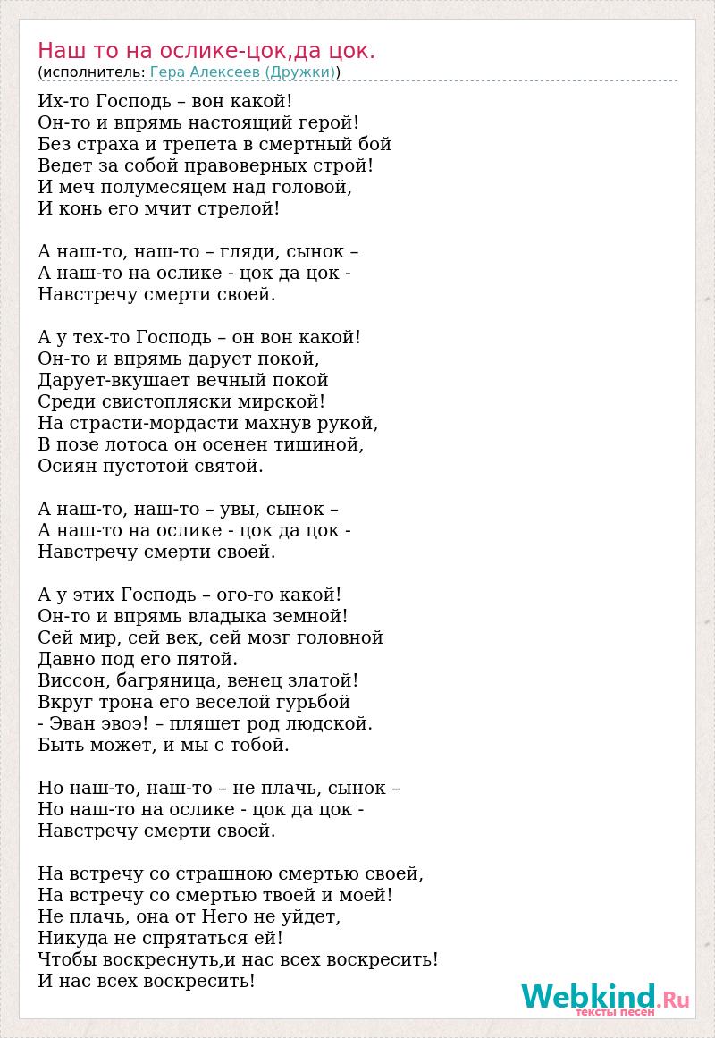 А как ты думаешь, о чем песня "Наш то на ослике-цок,да цок." ?