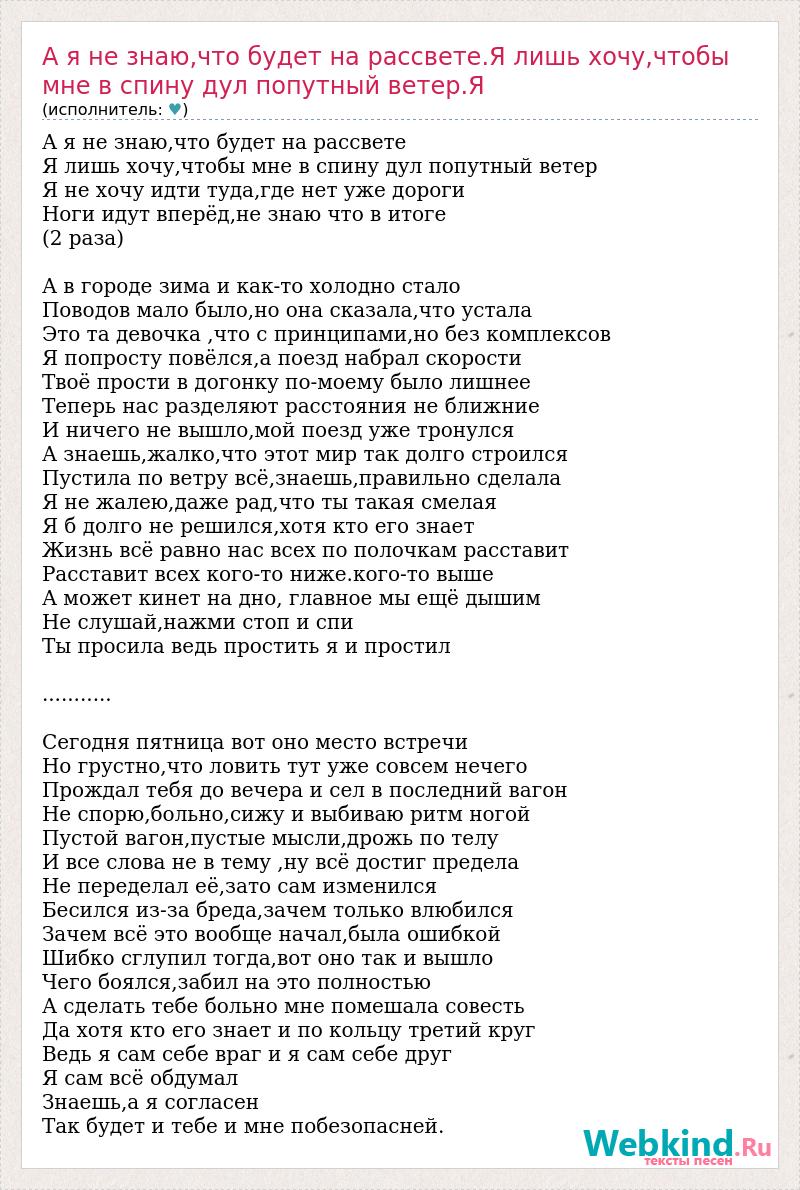 А я не знаю,что будет на рассвете Я лишь хочу,чтобы мне в спину дул попутный ветер Я не хочу идти туда,где нет уже дороги Ноги идут вперёд,не знаю что в итоге (2 раза) А в городе зима и как-то холодно стало Поводов мало было,но она сказала,что устала Это та девочка ,что с принципами,но без комплексов Я попросту повёлся,а поезд набрал скорости Твоё прости в догонку по-моему было лишнее Теперь нас разделяют расстояния не ближние И ничего не вышло,мой поезд уже тронулся А знаешь,жалко,что этот мир так долго строился Пустила по ветру всё,знаешь,правильно сделала Я не жалею,даже рад,что ты такая смелая Я б долго не решился,хотя кто его знает Жизнь всё равно нас всех по полочкам расставит Расставит всех кого-то ниже.кого-то выше А может кинет на дно, главное мы ещё дышим Не слушай,нажми стоп и спи Ты просила ведь простить я и простил ........... Сегодня пятница вот оно место встречи Но грустно,что ловить тут уже совсем нечего Прождал тебя до вечера и сел в последний вагон Не спорю,больно,сижу и выбиваю ритм ногой Пустой вагон,пустые мысли,дрожь по телу И все слова не в тему ,ну всё достиг предела Не переделал её,зато сам изменился Бесился из-за бреда,зачем только влюбился Зачем всё это вообще начал,была ошибкой Шибко сглупил тогда,вот оно так и вышло Чего боялся,забил на это полностью А сделать тебе больно мне помешала совесть Да хотя кто его знает и по кольцу третий круг Ведь я сам себе враг и я сам себе друг Я сам всё обдумал Знаешь,а я согласен Так будет и тебе и мне побезопасней.