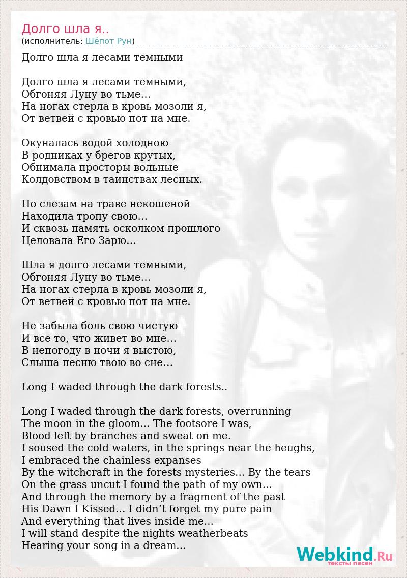 Долго шла я лесами темными Долго шла я лесами темными, Обгоняя Луну во тьме… На ногах стерла в кровь мозоли я, От ветвей с кровью пот на мне. Окуналась водой холодною В родниках у брегов крутых, Обнимала просторы вольные Колдовством в таинствах лесных. По слезам на траве некошеной Находила тропу свою… И сквозь память осколком прошлого Целовала Его Зарю… Шла я долго лесами темными, Обгоняя Луну во тьме… На ногах стерла в кровь мозоли я, От ветвей с кровью пот на мне. Не забыла боль свою чистую И все то, что живет во мне… В непогоду в ночи я выстою, Слыша песню твою во сне… Long I waded through the dark forests.. Long I waded through the dark forests, overrunning The moon in the gloom... The footsore I was, Blood left by branches and sweat on me. I soused the cold waters, in the springs near the heughs, I embraced the chainless expanses By the witchcraft in the forests mysteries... By the tears On the grass uncut I found the path of my own... And through the memory by a fragment of the past His Dawn I Kissed... I didn’t forget my pure pain And everything that lives inside me... I will stand despite the nights weatherbeats Hearing your song in a dream...