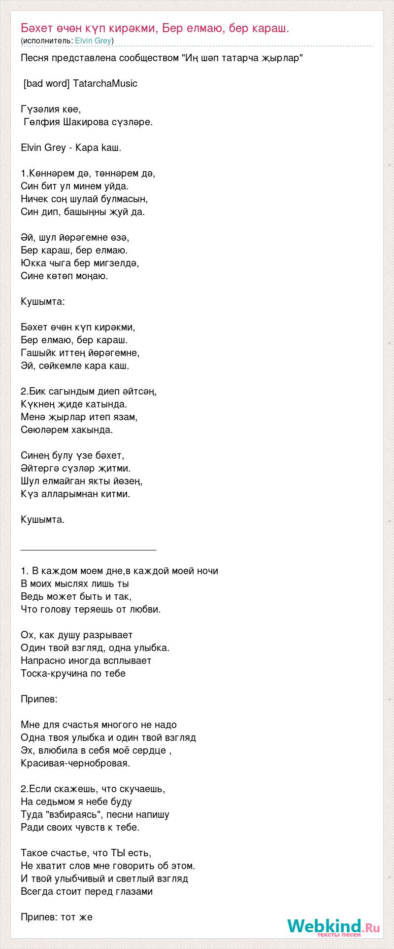 Песня представлена сообществом "Иң шәп татарча җырлар" [bad word] TatarchaMusic Гүзәлия көе, Гөлфия Шакирова сүзләре. Elvin Grey - Кара kаш. 1.Көннәрем дә, төннәрем дә, Син бит ул минем уйда. Ничек соң шулай булмасын, Син дип, башыңны җуй да. Әй, шул йөрәгемне өзә, Бер караш, бер елмаю. Юкка чыга бер мигзелдә, Сине көтөп моңаю. Кушымта: Бәхет өчөн күп кирәкми, Бер елмаю, бер караш. Гашыйк иттең йөрәгемне, Эй, сөйкемле кара каш. 2.Бик сагындым диеп әйтсәң, Күкнең җиде катында. Менә җырлар итеп язам, Сөюләрем хакында. Синең булу үзе бәхет, Әйтергә сүзләр җитми. Шул елмайган якты йөзең, Күз алларымнан китми. Кушымта. _________________________ 1. В каждом моем дне,в каждой моей ночи В моих мыслях лишь ты Ведь может быть и так, Что голову теряешь от любви. Ох, как душу разрывает Один твой взгляд, одна улыбка. Напрасно иногда всплывает Тоска-кручина по тебе Припев: Мне для счастья многого не надо Одна твоя улыбка и один твой взгляд Эх, влюбила в себя моё сердце , Красивая-чернобровая. 2.Если скажешь, что скучаешь, На седьмом я небе буду Туда "взбираясь", песни напишу Ради своих чувств к тебе. Такое счастье, что ТЫ есть, Не хватит слов мне говорить об этом. И твой улыбчивый и светлый взгляд Всегда стоит перед глазами Припев: тот же