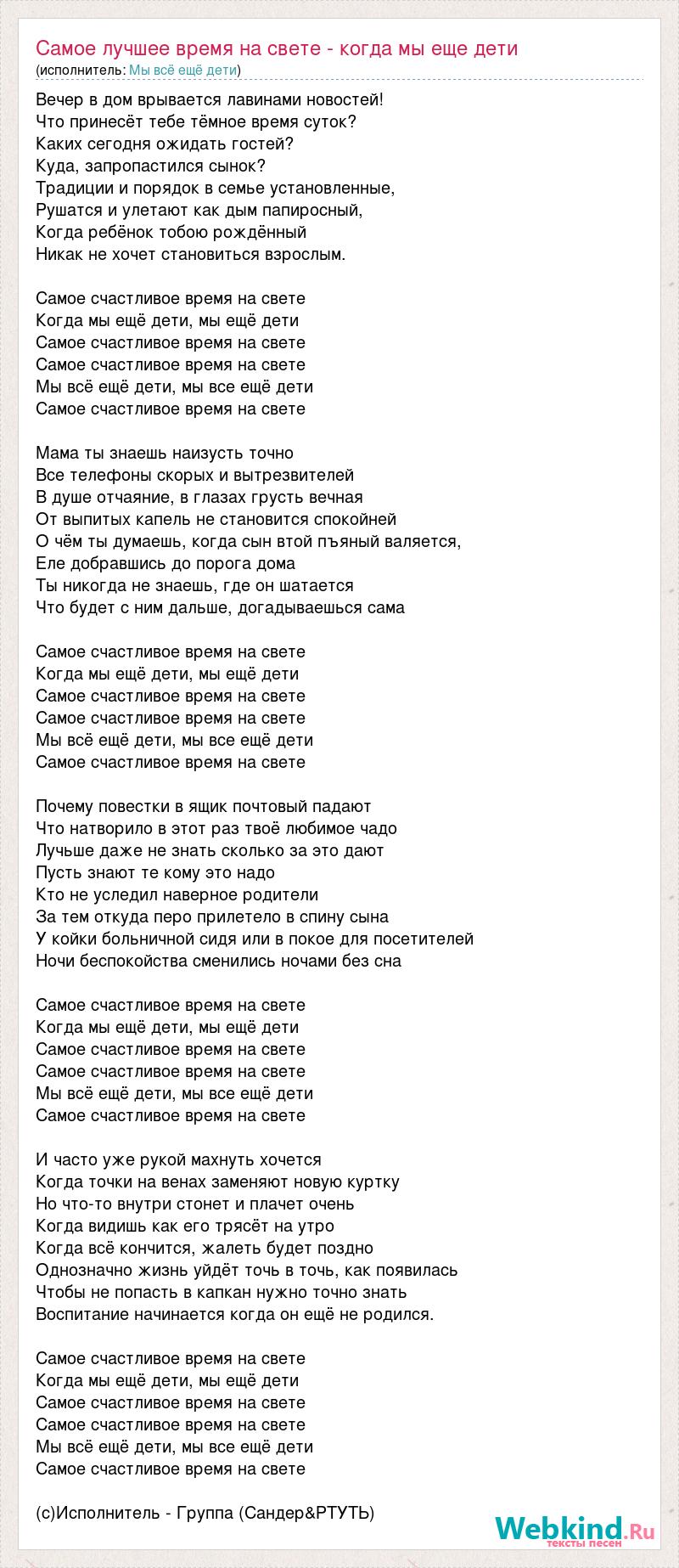 Вечер в дом врывается лавинами новостей! Что принесёт тебе тёмное время суток? Каких сегодня ожидать гостей? Куда, запропастился сынок? Традиции и порядок в семье установленные, Рушатся и улетают как дым папиросный, Когда ребёнок тобою рождённый Никак не хочет становиться взрослым. Самое счастливое время на свете Когда мы ещё дети, мы ещё дети Самое счастливое время на свете Самое счастливое время на свете Мы всё ещё дети, мы все ещё дети Самое счастливое время на свете Мама ты знаешь наизусть точно Все телефоны скорых и вытрезвителей В душе отчаяние, в глазах грусть вечная От выпитых капель не становится спокойней О чём ты думаешь, когда сын втой пъяный валяется, Еле добравшись до порога дома Ты никогда не знаешь, где он шатается Что будет с ним дальше, догадываешься сама Самое счастливое время на свете Когда мы ещё дети, мы ещё дети Самое счастливое время на свете Самое счастливое время на свете Мы всё ещё дети, мы все ещё дети Самое счастливое время на свете Почему повестки в ящик почтовый падают Что натворило в этот раз твоё любимое чадо Лучьше даже не знать сколько за это дают Пусть знают те кому это надо Кто не уследил наверное родители За тем откуда перо прилетело в спину сына У койки больничной сидя или в покое для посетителей Ночи беспокойства сменились ночами без сна Самое счастливое время на свете Когда мы ещё дети, мы ещё дети Самое счастливое время на свете Самое счастливое время на свете Мы всё ещё дети, мы все ещё дети Самое счастливое время на свете И часто уже рукой махнуть хочется Когда точки на венах заменяют новую куртку Но что-то внутри стонет и плачет очень Когда видишь как его трясёт на утро Когда всё кончится, жалеть будет поздно Однозначно жизнь уйдёт точь в точь, как появилась Чтобы не попасть в капкан нужно точно знать Воспитание начинается когда он ещё не родился. Самое счастливое время на свете Когда мы ещё дети, мы ещё дети Самое счастливое время на свете Самое счастливое время на свете Мы всё ещё дети, мы все ещё дети Самое счастливое время на свете (с)Исполнитель - Группа (Сандер&РТУТЬ)