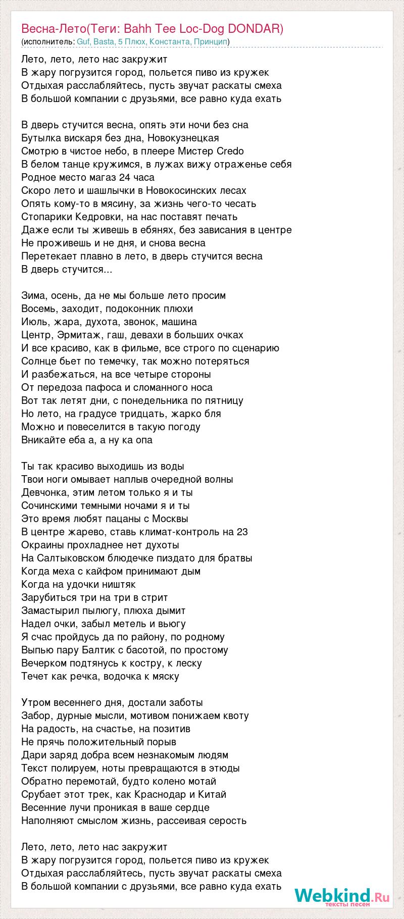 Лето, лето, лето нас закружит В жару погрузится город, польется пиво из кружек Отдыхая расслабляйтесь, пусть звучат раскаты смеха В большой компании с друзьями, все равно куда ехать В дверь стучится весна, опять эти ночи без сна Бутылка вискаря без дна, Новокузнецкая Смотрю в чистое небо, в плеере Мистер Credo В белом танце кружимся, в лужах вижу отраженье себя Родное место магаз 24 часа Скоро лето и шашлычки в Новокосинских лесах Опять кому-то в мясину, за жизнь чего-то чесать Стопарики Кедровки, на нас поставят печать Даже если ты живешь в ебянях, без зависания в центре Не проживешь и не дня, и снова весна Перетекает плавно в лето, в дверь стучится весна В дверь стучится... Зима, осень, да не мы больше лето просим Восемь, заходит, подоконник плюхи Июль, жара, духота, звонок, машина Центр, Эрмитаж, гаш, девахи в больших очках И все красиво, как в фильме, все строго по сценарию Солнце бьет по темечку, так можно потеряться И разбежаться, на все четыре стороны От передоза пафоса и сломанного носа Вот так летят дни, с понедельника по пятницу Но лето, на градусе тридцать, жарко бля Можно и повеселится в такую погоду Вникайте еба а, а ну ка опа Ты так красиво выходишь из воды Твои ноги омывает наплыв очередной волны Девчонка, этим летом только я и ты Сочинскими темными ночами я и ты Это время любят пацаны с Москвы В центре жарево, ставь климат-контроль на 23 Окраины прохладнее нет духоты На Салтыковском блюдечке пиздато для братвы Когда меха с кайфом принимают дым Когда на удочки ништяк Зарубиться три на три в стрит Замастырил пылюгу, плюха дымит Надел очки, забыл метель и вьюгу Я счас пройдусь да по району, по родному Выпью пару Балтик с басотой, по простому Вечерком подтянусь к костру, к леску Течет как речка, водочка к мяску Утром весеннего дня, достали заботы Забор, дурные мысли, мотивом понижаем квоту На радость, на счастье, на позитив Не прячь положительный порыв Дари заряд добра всем незнакомым людям Текст полируем, ноты превращаются в этюды Обратно перемотай, будто колено мотай Срубает этот трек, как Краснодар и Китай Весенние лучи проникая в ваше сердце Наполняют смыслом жизнь, рассеивая серость Лето, лето, лето нас закружит В жару погрузится город, польется пиво из кружек Отдыхая расслабляйтесь, пусть звучат раскаты смеха В большой компании с друзьями, все равно куда ехать