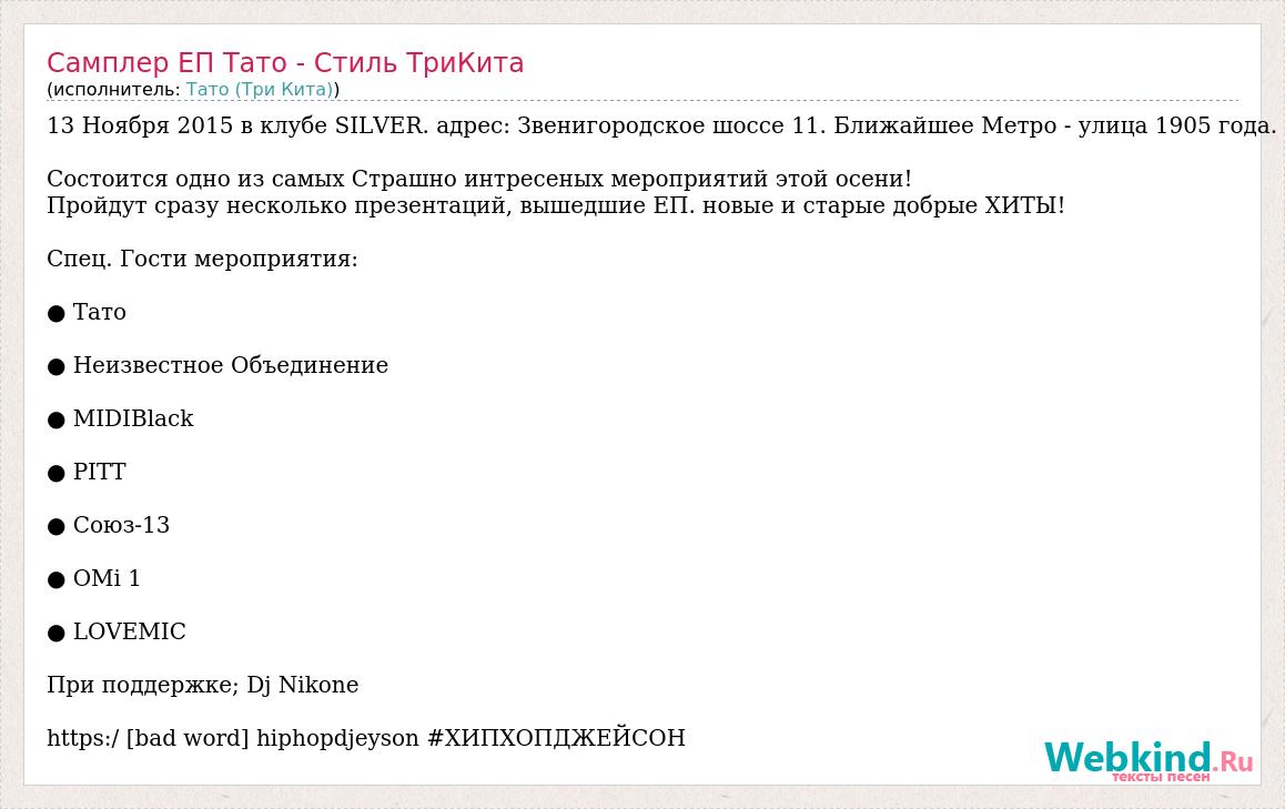 13 Ноября 2015 в клубе SILVER. адрес: Звенигородское шоссе 11. Ближайшее Метро - улица 1905 года. Состоится одно из самых Страшно интресеных мероприятий этой осени! Пройдут сразу несколько презентаций, вышедшие ЕП. новые и старые добрые ХИТЫ! Спец. Гости мероприятия: ● Тато ● Неизвестное Объединение ● MIDIBlack ● PITT ● Cоюз-13 ● OMi 1 ● LОVEMIC При поддержке; Dj Nikone https:/ [bad word] hiphopdjeyson #ХИПХОПДЖЕЙСОН