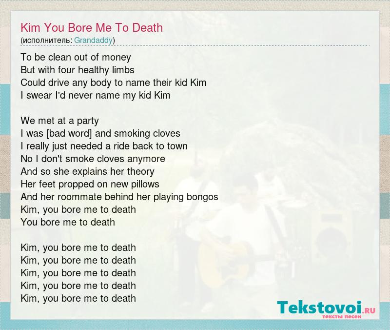 To be clean out of money But with four healthy limbs Could drive any body to name their kid Kim I swear I'd never name my kid Kim We met at a party I was [bad word] and smoking cloves I really just needed a ride back to town No I don't smoke cloves anymore And so she explains her theory Her feet propped on new pillows And her roommate behind her playing bongos Kim, you bore me to death You bore me to death Kim, you bore me to death Kim, you bore me to death Kim, you bore me to death Kim, you bore me to death Kim, you bore me to death