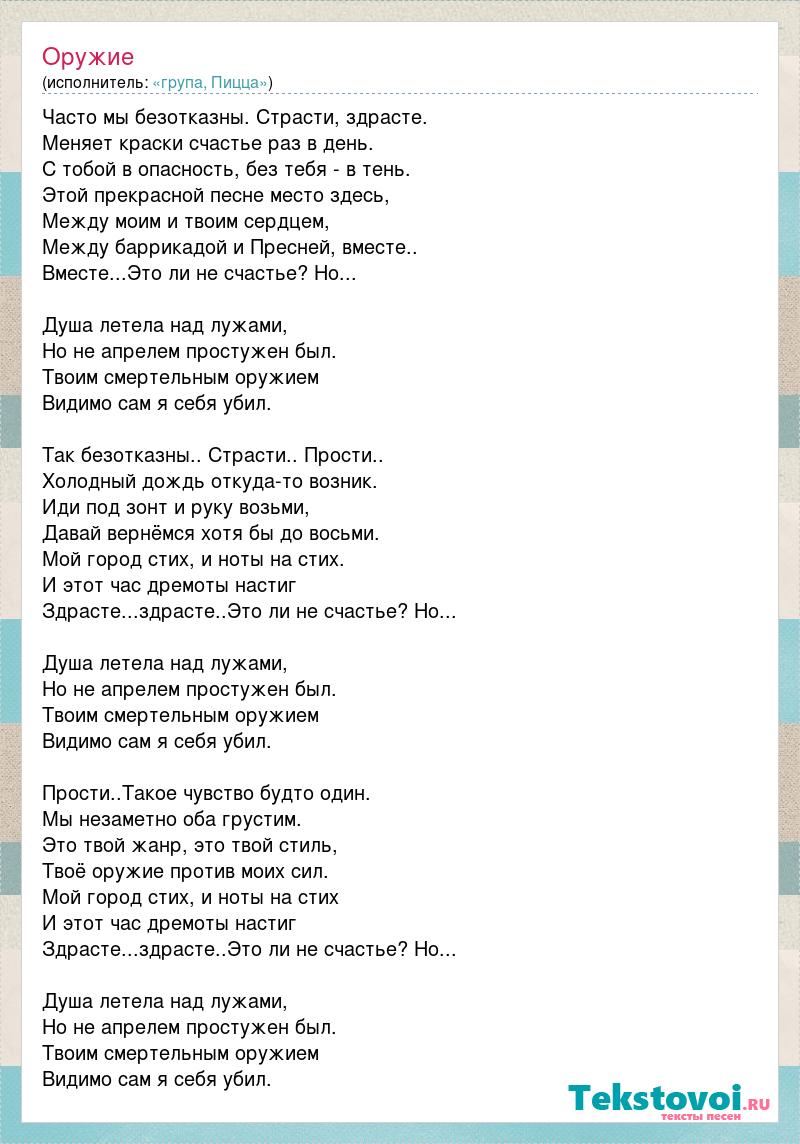 Часто мы безотказны. Страсти, здрасте. Меняет краски счастье раз в день. С тобой в опасность, без тебя - в тень. Этой прекрасной песне место здесь, Между моим и твоим сердцем, Между баррикадой и Пресней, вместе.. Вместе...Это ли не счастье? Но... Душа летела над лужами, Но не апрелем простужен был. Твоим смертельным оружием Видимо сам я себя убил. Так безотказны.. Страсти.. Прости.. Холодный дождь откуда-то возник. Иди под зонт и руку возьми, Давай вернёмся хотя бы до восьми. Мой город стих, и ноты на стих. И этот час дремоты настиг Здрасте...здрасте..Это ли не счастье? Но... Душа летела над лужами, Но не апрелем простужен был. Твоим смертельным оружием Видимо сам я себя убил. Прости..Такое чувство будто один. Мы незаметно оба грустим. Это твой жанр, это твой стиль, Твоё оружие против моих сил. Мой город стих, и ноты на стих И этот час дремоты настиг Здрасте...здрасте..Это ли не счастье? Но... Душа летела над лужами, Но не апрелем простужен был. Твоим смертельным оружием Видимо сам я себя убил.