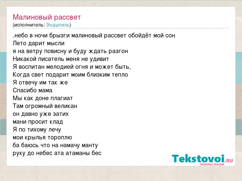 .небо в ночи брызги малиновый рассвет обойдёт мой сон Лето дарит мысли я на ветру повисну и буду ждать разгон Никакой писатель меня не удивит Я воспитан мелодией огня и может быть, Когда свет подарит моим близким тепло Я отвечу им так же Спасибо мама Мы как доне плагиат Там огромный великан он давно уже затих мани просит клад Я по тихому лечу мои крылья тороплю ба баюсь что на намачу манту руку до небес ата атаманы бес