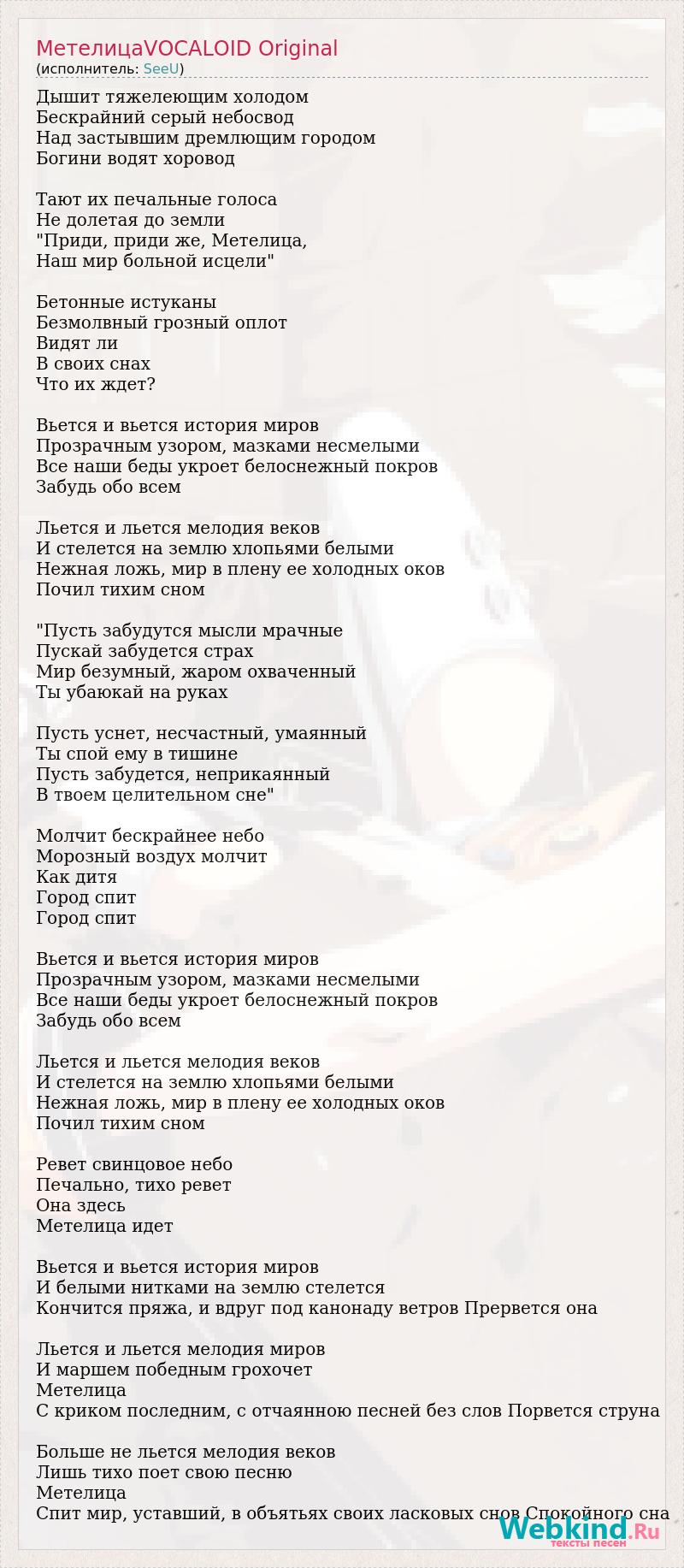 Дышит тяжелеющим холодом Бескрайний серый небосвод Над застывшим дремлющим городом Богини водят хоровод Тают их печальные голоса Не долетая до земли "Приди, приди же, Метелица, Наш мир больной исцели" Бетонные истуканы Безмолвный грозный оплот Видят ли В своих снах Что их ждет? Вьется и вьется история миров Прозрачным узором, мазками несмелыми Все наши беды укроет белоснежный покров Забудь обо всем Льется и льется мелодия веков И стелется на землю хлопьями белыми Нежная ложь, мир в плену ее холодных оков Почил тихим сном "Пусть забудутся мысли мрачные Пускай забудется страх Мир безумный, жаром охваченный Ты убаюкай на руках Пусть уснет, несчастный, умаянный - Ты спой ему в тишине Пусть забудется, неприкаянный В твоем целительном сне" Молчит бескрайнее небо Морозный воздух молчит Как дитя Город спит Город спит Вьется и вьется история миров Прозрачным узором, мазками несмелыми Все наши беды укроет белоснежный покров Забудь обо всем Льется и льется мелодия веков И стелется на землю хлопьями белыми Нежная ложь, мир в плену ее холодных оков Почил тихим сном Ревет свинцовое небо Печально, тихо ревет Она здесь Метелица идет Вьется и вьется история миров И белыми нитками на землю стелется Кончится пряжа, и вдруг под канонаду ветров Прервется она Льется и льется мелодия миров И маршем победным грохочет Метелица С криком последним, с отчаянною песней без слов Порвется струна Больше не льется мелодия веков Лишь тихо поет свою песню Метелица Спит мир, уставший, в объятьях своих ласковых снов Спокойного сна