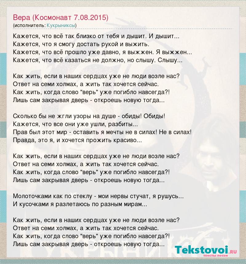 Кажется, что всё так близко от тебя и дышит. И дышит... Кажется, что я смогу достать рукой и выжить. Кажется, что всё прошло уже давно, я выжжен. Я выжжен... Кажется, что всё казаться не должно, но слышу. Слышу... Как жить, если в наших сердцах уже не люди возле нас? Ответ на семи холмах, а жить так хочется сейчас. Как жить, когда слово "верь" уже погибло навсегда?! Лишь сам закрывая дверь - откроешь новую тогда... Сколько бы не жгли узоры на душе - обиды! Обиды! Кажется, что все они уже ушли, разбиты... Прав был этот мир - оставить я мечты не в силах! Не в силах! Правда, это я, и хочется прожить красиво... Как жить, если в наших сердцах уже не люди возле нас? Ответ на семи холмах, а жить так хочется сейчас. Как жить, когда слово "верь" уже погибло навсегда?! Лишь сам закрывая дверь - откроешь новую тогда... Молоточками как по стеклу - мои нервы стучат, я рушусь... И кусочками я разлетаюсь по разным мирам... Как жить, если в наших сердцах уже не люди возле нас? Ответ на семи холмах, а жить так хочется сейчас. Как жить, когда слово "верь" уже погибло навсегда?! Лишь сам закрывая дверь - откроешь новую тогда...