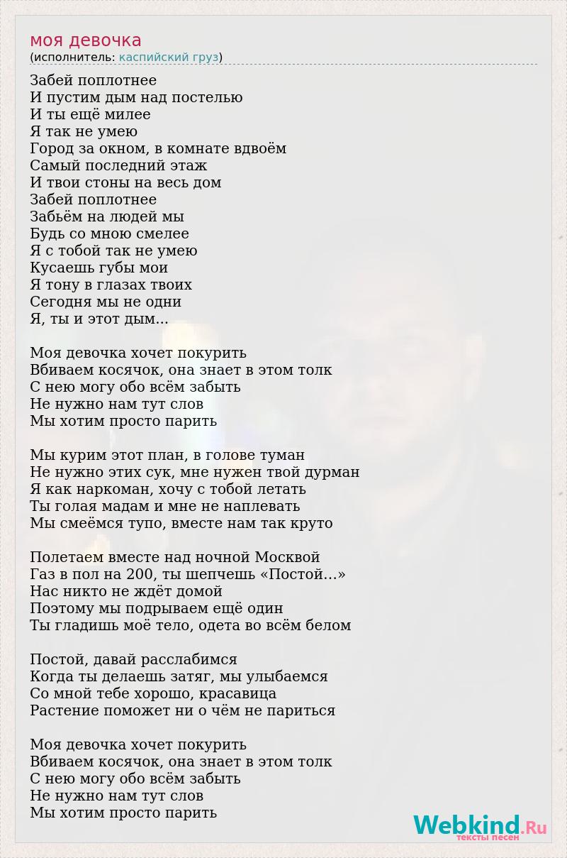 Забей поплотнее И пустим дым над постелью И ты ещё милее Я так не умею Город за окном, в комнате вдвоём Самый последний этаж И твои стоны на весь дом Забей поплотнее Забьём на людей мы Будь со мною смелее Я с тобой так не умею Кусаешь губы мои Я тону в глазах твоих Сегодня мы не одни Я, ты и этот дым... Моя девочка хочет покурить Вбиваем косячок, она знает в этом толк С нею могу обо всём забыть Не нужно нам тут слов Мы хотим просто парить Мы курим этот план, в голове туман Не нужно этих сук, мне нужен твой дурман Я как наркоман, хочу с тобой летать Ты голая мадам и мне не наплевать Мы смеёмся тупо, вместе нам так круто Полетаем вместе над ночной Москвой Газ в пол на 200, ты шепчешь «Постой…» Нас никто не ждёт домой Поэтому мы подрываем ещё один Ты гладишь моё тело, одета во всём белом Постой, давай расслабимся Когда ты делаешь затяг, мы улыбаемся Со мной тебе хорошо, красавица Растение поможет ни о чём не париться Моя девочка хочет покурить Вбиваем косячок, она знает в этом толк С нею могу обо всём забыть Не нужно нам тут слов Мы хотим просто парить