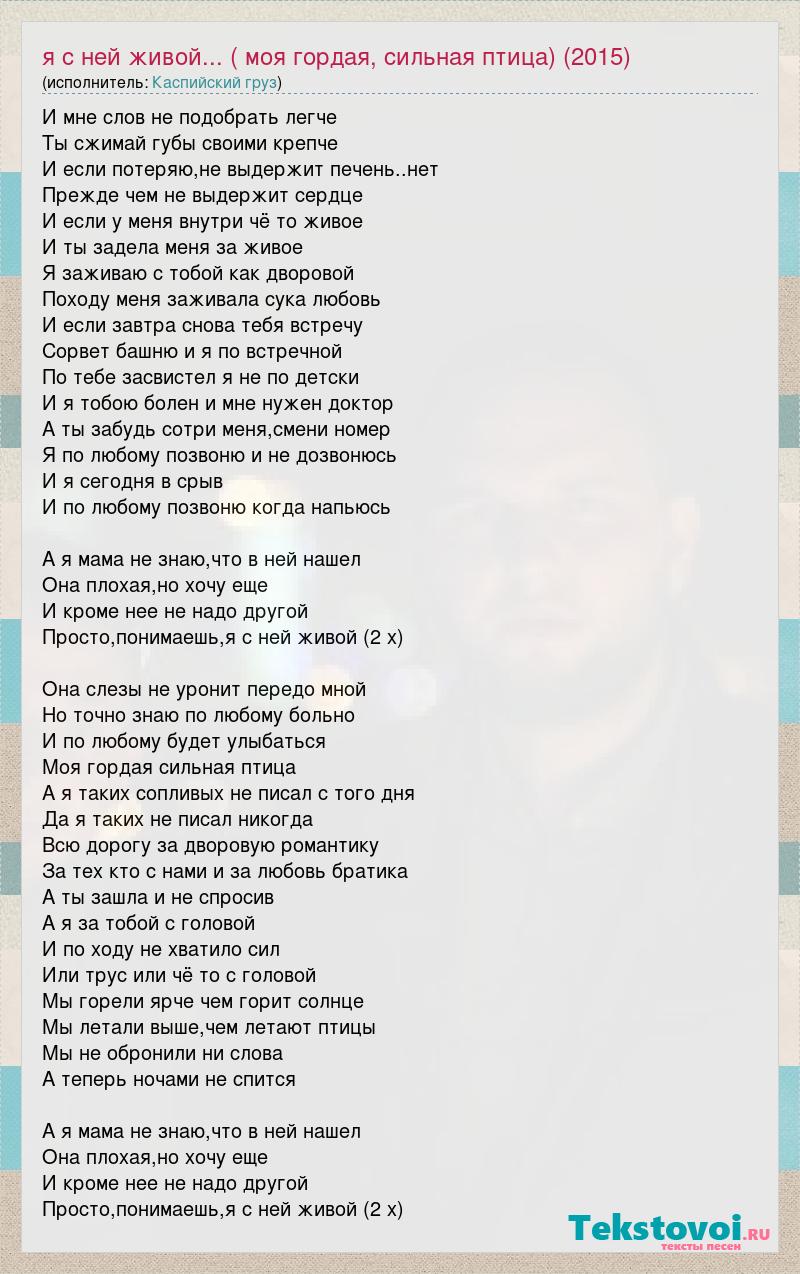 И мне слов не подобрать легче Ты сжимай губы своими крепче И если потеряю,не выдержит печень..нет Прежде чем не выдержит сердце И если у меня внутри чё то живое И ты задела меня за живое Я заживаю с тобой как дворовой Походу меня заживала сука любовь И если завтра снова тебя встречу Сорвет башню и я по встречной По тебе засвистел я не по детски И я тобою болен и мне нужен доктор А ты забудь сотри меня,смени номер Я по любому позвоню и не дозвонюсь И я сегодня в срыв И по любому позвоню когда напьюсь А я мама не знаю,что в ней нашел Она плохая,но хочу еще И кроме нее не надо другой Просто,понимаешь,я с ней живой (2 х) Она слезы не уронит передо мной Но точно знаю по любому больно И по любому будет улыбаться Моя гордая сильная птица А я таких сопливых не писал с того дня Да я таких не писал никогда Всю дорогу за дворовую романтику За тех кто с нами и за любовь братика А ты зашла и не спросив А я за тобой с головой И по ходу не хватило сил Или трус или чё то с головой Мы горели ярче чем горит солнце Мы летали выше,чем летают птицы Мы не обронили ни слова А теперь ночами не спится А я мама не знаю,что в ней нашел Она плохая,но хочу еще И кроме нее не надо другой Просто,понимаешь,я с ней живой (2 х)