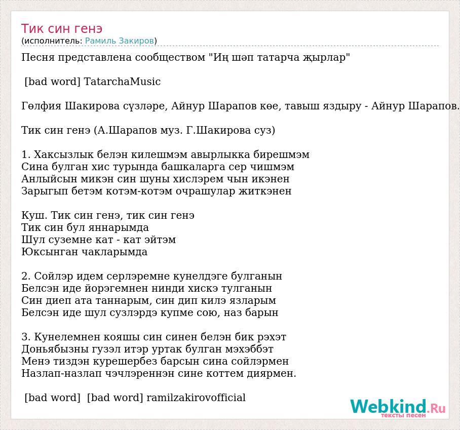 Песня представлена сообществом "Иң шәп татарча җырлар" [bad word] TatarchaMusic Гөлфия Шакирова сүзләре, Айнур Шарапов көе, тавыш яздыру - Айнур Шарапов. Тик син генэ (А.Шарапов муз. Г.Шакирова суз) 1. Хаксызлык белэн килешмэм авырлыкка бирешмэм Сина булган хис турында башкаларга сер чишмэм Анлыйсын микэн син шуны хислэрем чын икэнен Зарыгып бетэм котэм-котэм очрашулар житкэнен Куш. Тик син генэ, тик син генэ Тик син бул яннарымда Шул суземне кат - кат эйтэм Юксынган чакларымда 2. Сойлэр идем серлэремне кунелдэге булганын Белсэн иде йорэгемнен нинди хискэ тулганын Син диеп ата таннарым, син дип килэ язларым Белсэн иде шул сузлэрдэ купме сою, наз барын 3. Кунелемнен кояшы син синен белэн бик рэхэт Доньябызны гузэл итэр уртак булган мэхэббэт Менэ тиздэн курешербез барсын сина сойлэрмен Назлап-назлап чэчлэреннэн сине коттем диярмен. [bad word] [bad word] ramilzakirovofficial