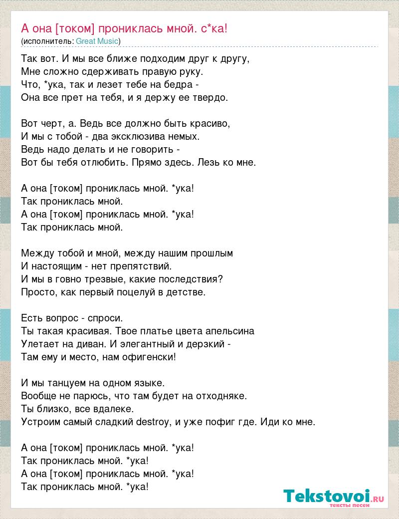Так вот. И мы все ближе подходим друг к другу, Мне сложно сдерживать правую руку. Что, *ука, так и лезет тебе на бедра - Она все прет на тебя, и я держу ее твердо. Вот черт, а. Ведь все должно быть красиво, И мы с тобой - два эксклюзива немых. Ведь надо делать и не говорить - Вот бы тебя отлюбить. Прямо здесь. Лезь ко мне. А она [током] прониклась мной. *ука! Так прониклась мной. А она [током] прониклась мной. *ука! Так прониклась мной. Между тобой и мной, между нашим прошлым И настоящим - нет препятствий. И мы в говно трезвые, какие последствия? Просто, как первый поцелуй в детстве. Есть вопрос - спроси. Ты такая красивая. Твое платье цвета апельсина Улетает на диван. И элегантный и дерзкий - Там ему и место, нам офигенски! И мы танцуем на одном языке. Вообще не парюсь, что там будет на отходняке. Ты близко, все вдалеке. Устроим самый сладкий destroy, и уже пофиг где. Иди ко мне. А она [током] прониклась мной. *ука! Так прониклась мной. *ука! А она [током] прониклась мной. *ука! Так прониклась мной. *ука!