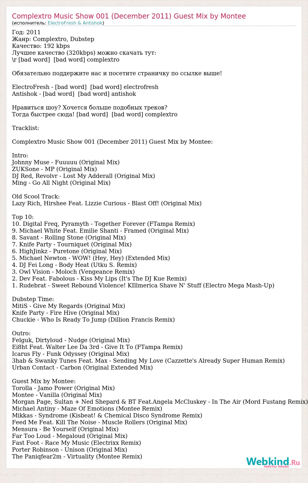 Год: 2011 Жанр: Complextro, Dubstep Качество: 192 kbps Лучшее качество (320kbps) можно скачать тут: \r [bad word] [bad word] complextro Обязательно поддержите нас и посетите страничку по ссылке выше! ElectroFresh - [bad word] [bad word] electrofresh Antishok - [bad word] [bad word] antishok Нравиться шоу? Хочется больше подобных треков? Тогда быстрее сюда! [bad word] [bad word] complextro Tracklist: Complextro Music Show 001 (December 2011) Guest Mix by Montee: Intro: Johnny Muse - Fuuuuu (Original Mix) ZUKSone - MP (Original Mix) DJ Red, Revolvr - Lost My Adderall (Original Mix) Ming - Go All Night (Original Mix) Old Scool Track: Lazy Rich, Hirshee Feat. Lizzie Curious - Blast Off! (Original Mix) Top 10: 10. Digital Freq, Pyramyth - Together Forever (FTampa Remix) 9. Michael White Feat. Emilie Shanti - Framed (Original Mix) 8. Savant - Rolling Stone (Original Mix) 7. Knife Party - Tourniquet (Original Mix) 6. HighJinkz - Puretone (Original Mix) 5. Michael Newton - WOW! (Hey, Hey) (Extended Mix) 4. DJ Fei Long - Body Heat (Utku S. Remix) 3. Owl Vision - Moloch (Vengeance Remix) 2. Dev Feat. Fabolous - Kiss My Lips (It's The DJ Kue Remix) 1. Rudebrat - Sweet Rebound Violence! KIllmerica Shave N' Stuff (Electro Mega Mash-Up) Dubstep Time: MitiS - Give My Regards (Original Mix) Knife Party - Fire Hive (Original Mix) Chuckie - Who Is Ready To Jump (Dillion Francis Remix) Outro: Felguk, Dirtyloud - Nudge (Original Mix) Ei8ht Feat. Walter Lee Da 3rd - Give It To (FTampa Remix) Icarus Fly - Funk Odyssey (Original Mix) 3hab & Swanky Tunes Feat. Max - Sending My Love (Cazzette's Already Super Human Remix) Urban Contact - Carbon (Original Extended Mix) Guest Mix by Montee: Torolla - Jamo Power (Original Mix) Montee - Vanilla (Original Mix) Morgan Page, Sultan + Ned Shepard & BT Feat.Angela McCluskey - In The Air (Mord Fustang Remix) Michael Antiny - Maze Of Emotions (Montee Remix) Mikkas - Syndrome (Kisbeat! & Chemical Disco Syndrome Remix) Feed Me Feat. Kill The Noise - Muscle Rollers (Original Mix) Mensura - Be Yourself (Original Mix) Far Too Loud - Megaloud (Original Mix) Fast Foot - Race My Music (Electrixx Remix) Porter Robinson - Unison (Original Mix) The Paniqfear2m - Virtuality (Montee Remix)