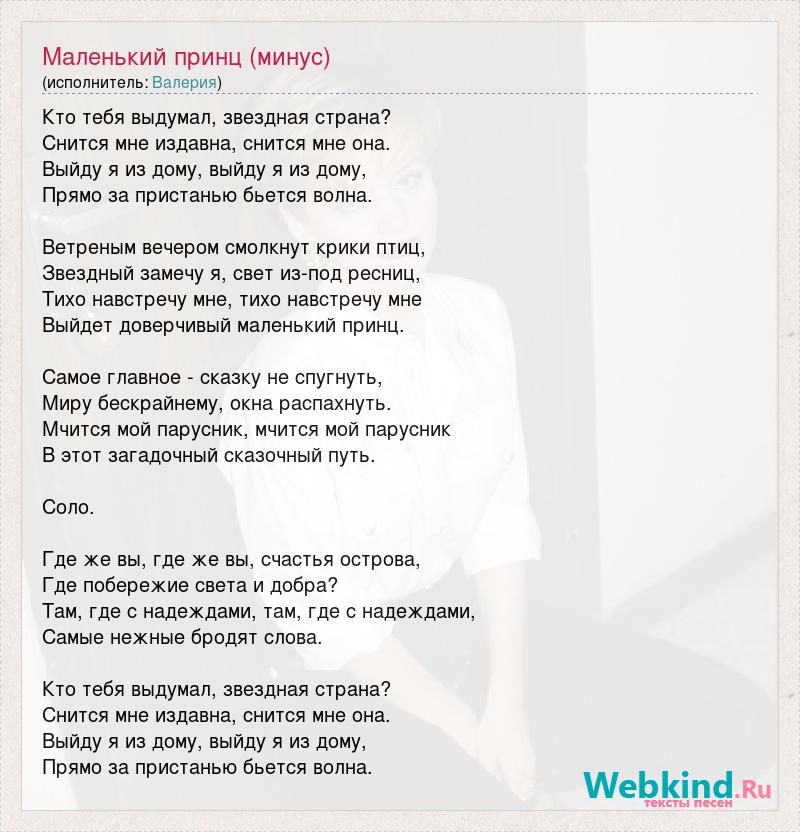 Кто тебя выдумал, звездная страна? Снится мне издавна, снится мне она. Выйду я из дому, выйду я из дому, Прямо за пристанью бьется волна. Ветреным вечером смолкнут крики птиц, Звездный замечу я, свет из-под ресниц, Тихо навстречу мне, тихо навстречу мне Выйдет доверчивый маленький принц. Самое главное - сказку не спугнуть, Миру бескрайнему, окна распахнуть. Мчится мой парусник, мчится мой парусник В этот загадочный сказочный путь. Соло. Где же вы, где же вы, счастья острова, Где побережие света и добра? Там, где с надеждами, там, где с надеждами, Самые нежные бродят слова. Кто тебя выдумал, звездная страна? Снится мне издавна, снится мне она. Выйду я из дому, выйду я из дому, Прямо за пристанью бьется волна.
