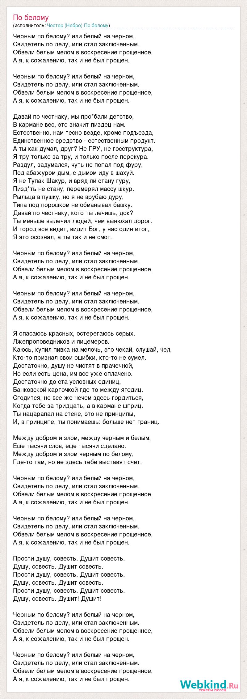 Черным по белому? или белый на черном, Свидетель по делу, или стал заключенным. Обвели белым мелом в воскресение прощенное, А я, к сожалению, так и не был прощен. Черным по белому? или белый на черном, Свидетель по делу, или стал заключенным. Обвели белым мелом в воскресение прощенное, А я, к сожалению, так и не был прощен. Давай по честнаку, мы про*бали детство, В кармане вес, это значит пиздец нам. Естественно, нам тесно везде, кроме подъезда, Единственное средство - естественным продукт. А ты как думал, друг? Не ГРУ, не госструктура, Я тру только за тру, и только после перекура. Раздул, задумался, чуть не попал под фуру, Под абажуром дым, с дымом иду в шахуй. Я не Тупак Шакур, и вряд ли стану гуру, Пизд*ть не стану, перемерял массу шкур. Рыльца в пушку, но я не врубаю дуру, Типа под порошком не обманывал башку. Давай по честнаку, кого ты лечишь, док? Ты меньше вылечил людей, чем вынюхал дорог. И город все видит, видит Бог, у нас один итог, Я это осознал, а ты так и не смог. Черным по белому? или белый на черном, Свидетель по делу, или стал заключенным. Обвели белым мелом в воскресение прощенное, А я, к сожалению, так и не был прощен. Черным по белому? или белый на черном, Свидетель по делу, или стал заключенным. Обвели белым мелом в воскресение прощенное, А я, к сожалению, так и не был прощен. Я опасаюсь красных, остерегаюсь серых. Лжепроповедников и лицемеров. Каюсь, купил пивка на мелочь, это чекай, слушай, чел, Кто-то признал свои ошибки, кто-то не сумел. Достаточно, душу не чистят в прачечной, Но если есть цена, им все уже оплачено. Достаточно до ста условных единиц, Банковской карточкой где-то между ягодиц. Сгодится, но все же нечем здесь гордиться, Когда тебе за тридцать, а в кармане шприц. Ты нацарапал на стене, это не принципы, И, в принципе, ты понимаешь: больше нет границ. Между добром и злом, между черным и белым, Еще тысячи слов, еще тысячи сделано. Между добром и злом черным по белому, Где-то там, но не здесь тебе выставят счет. Черным по белому? или белый на черном, Свидетель по делу, или стал заключенным. Обвели белым мелом в воскресение прощенное, А я, к сожалению, так и не был прощен. Черным по белому? или белый на черном, Свидетель по делу, или стал заключенным. Обвели белым мелом в воскресение прощенное, А я, к сожалению, так и не был прощен. Прости душу, совесть. Душит совесть. Душу, совесть. Душит совесть. Прости душу, совесть. Душит совесть. Душу, совесть. Душит совесть. Прости душу, совесть. Душит совесть. Душу, совесть. Душит! Душит! Черным по белому? или белый на черном, Свидетель по делу, или стал заключенным. Обвели белым мелом в воскресение прощенное, А я, к сожалению, так и не был прощен. Черным по белому? или белый на черном, Свидетель по делу, или стал заключенным. Обвели белым мелом в воскресение прощенное, А я, к сожалению, так и не был прощен.
