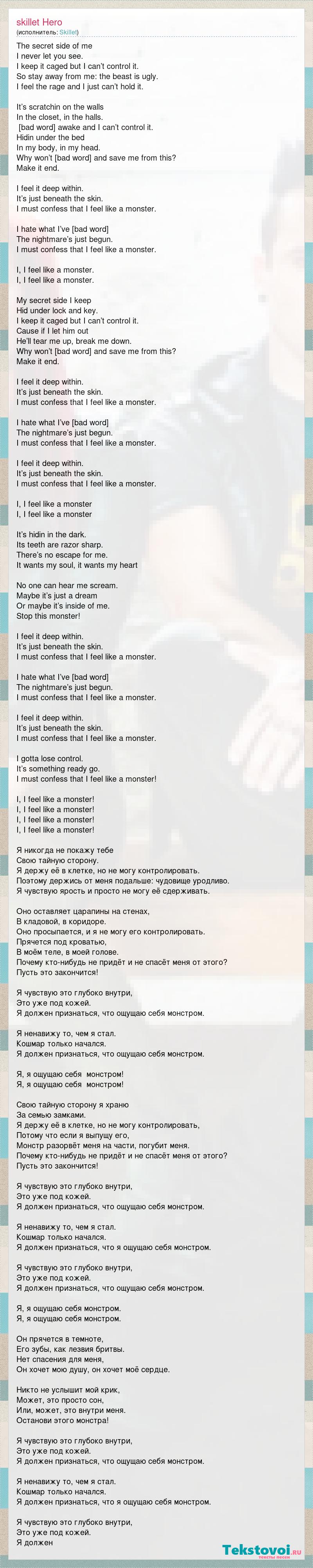 The secret side of me I never let you see. I keep it caged but I can’t control it. So stay away from me: the beast is ugly. I feel the rage and I just can’t hold it. It’s scratchin on the walls In the closet, in the halls. [bad word] awake and I can’t control it. Hidin under the bed In my body, in my head. Why won’t [bad word] and save me from this? Make it end. I feel it deep within. It’s just beneath the skin. I must confess that I feel like a monster. I hate what I’ve [bad word] The nightmare’s just begun. I must confess that I feel like a monster. I, I feel like a monster. I, I feel like a monster. My secret side I keep Hid under lock and key. I keep it caged but I can’t control it. Cause if I let him out He’ll tear me up, break me down. Why won’t [bad word] and save me from this? Make it end. I feel it deep within. It’s just beneath the skin. I must confess that I feel like a monster. I hate what I’ve [bad word] The nightmare’s just begun. I must confess that I feel like a monster. I feel it deep within. It’s just beneath the skin. I must confess that I feel like a monster. I, I feel like a monster I, I feel like a monster It’s hidin in the dark. Its teeth are razor sharp. There’s no escape for me. It wants my soul, it wants my heart No one can hear me scream. Maybe it’s just a dream Or maybe it’s inside of me. Stop this monster! I feel it deep within. It’s just beneath the skin. I must confess that I feel like a monster. I hate what I’ve [bad word] The nightmare’s just begun. I must confess that I feel like a monster. I feel it deep within. It’s just beneath the skin. I must confess that I feel like a monster. I gotta lose control. It’s something ready go. I must confess that I feel like a monster! I, I feel like a monster! I, I feel like a monster! I, I feel like a monster! I, I feel like a monster! Я никогда не покажу тебе Свою тайную сторону. Я держу её в клетке, но не могу контролировать. Поэтому держись от меня подальше: чудовище уродливо. Я чувствую ярость и просто не могу её сдерживать. Оно оставляет царапины на стенах, В кладовой, в коридоре. Оно просыпается, и я не могу его контролировать. Прячется под кроватью, В моём теле, в моей голове. Почему кто-нибудь не придёт и не спасёт меня от этого? Пусть это закончится! Я чувствую это глубоко внутри, Это уже под кожей. Я должен признаться, что ощущаю себя монстром. Я ненавижу то, чем я стал. Кошмар только начался. Я должен признаться, что ощущаю себя монстром. Я, я ощущаю себя монстром! Я, я ощущаю себя монстром! Свою тайную сторону я храню За семью замками. Я держу её в клетке, но не могу контролировать, Потому что если я выпущу его, Монстр разорвёт меня на части, погубит меня. Почему кто-нибудь не придёт и не спасёт меня от этого? Пусть это закончится! Я чувствую это глубоко внутри, Это уже под кожей. Я должен признаться, что ощущаю себя монстром. Я ненавижу то, чем я стал. Кошмар только начался. Я должен признаться, что я ощущаю себя монстром. Я чувствую это глубоко внутри, Это уже под кожей. Я должен признаться, что ощущаю себя монстром. Я, я ощущаю себя монстром. Я, я ощущаю себя монстром. Он прячется в темноте, Его зубы, как лезвия бритвы. Нет спасения для меня, Он хочет мою душу, он хочет моё сердце. Никто не услышит мой крик, Может, это просто сон, Или, может, это внутри меня. Останови этого монстра! Я чувствую это глубоко внутри, Это уже под кожей. Я должен признаться, что ощущаю себя монстром. Я ненавижу то, чем я стал. Кошмар только начался. Я должен признаться, что я ощущаю себя монстром. Я чувствую это глубоко внутри, Это уже под кожей. Я должен
