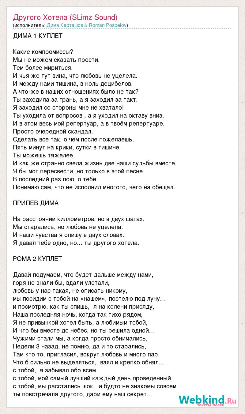 ДИМА 1 КУПЛЕТ Какие компромиссы? Мы не можем сказать прости. Тем более мириться. И чья же тут вина, что любовь не уцелела. И между нами тишина, в ноль децибелов. А что-же в наших отношениях было не так? Ты заходила за грань, а я заходил за такт. Я заходил со стороны мне не хватало! Ты уходила от вопросов , а я уходил на октаву вниз. И в этом весь мой репертуар, а в твоём репертуаре. Просто очередной скандал. Сделать все так, о чем после пожелаешь. Пять минут на крики, сутки в тишине. Ты можешь тяжелее. И как же странно свела жизнь две наши судьбы вместе. Я бы мог пересвести, но только в этой песне. В последний раз пою, о тебе. Понимаю сам, что не исполнил многого, чего на обещал. ПРИПЕВ ДИМА На расстоянии киллометров, но в двух шагах. Мы старались, но любовь не уцелела. И наши чувства я опишу в двух словах. Я давал тебе одно, но... ты другого хотела. РОМА 2 КУПЛЕТ Давай подумаем, что будет дальше между нами, горя не знали бы, вдали улетали, любовь у нас такая, не описать никому, мы посидим с тобой на «нашем», постелю под луну… и посмотрю, как ты спишь, я на колени присяду, Наша последняя ночь, когда так тихо рядом, Я не привычкой хотел быть, а любимым тобой, И что бы вместе до небес, но ты решила одной… Чужими стали мы, а когда просто обнимались, Недели 3 назад, не помню, да и то старались, Там кто то, пригласил, вокруг любовь и много пар, Что б сильно не выделяться, взял и крепко обнял… с тобой, я забывал обо всем с тобой, мой самый лучший каждый день проведенный, с тобой, мы расстались шок, и будто не знакомы совсем ты повстречала другого, дари ему наш секрет…