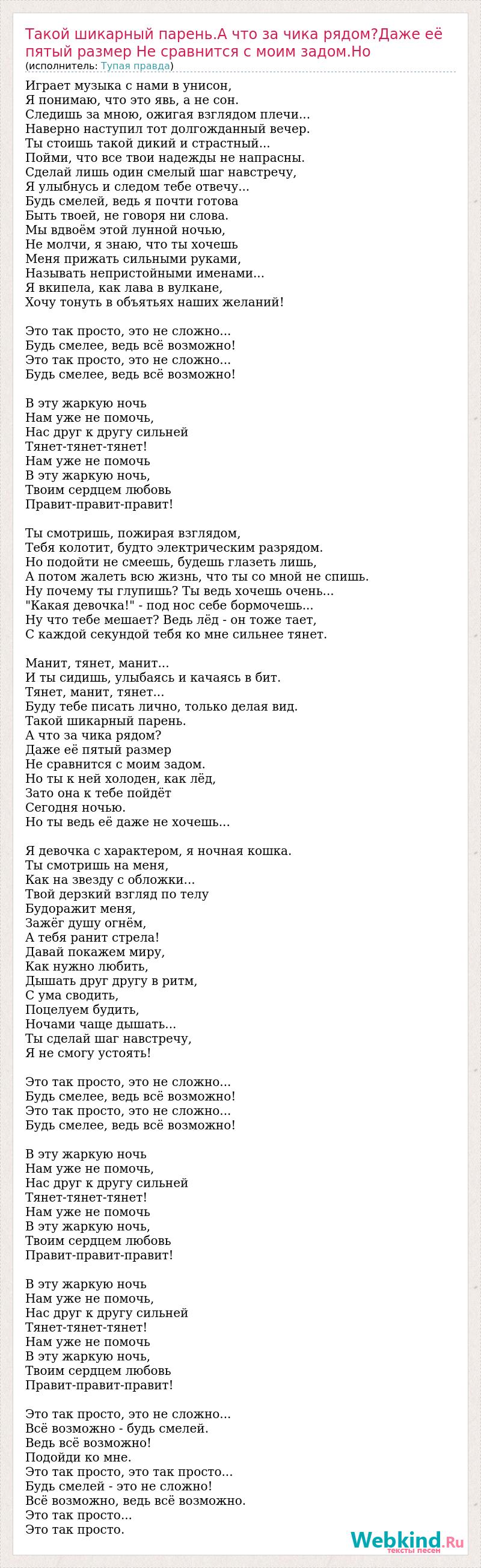 Играет музыка с нами в унисон, Я понимаю, что это явь, а не сон. Следишь за мною, ожигая взглядом плечи... Наверно наступил тот долгожданный вечер. Ты стоишь такой дикий и страстный... Пойми, что все твои надежды не напрасны. Сделай лишь один смелый шаг навстречу, Я улыбнусь и следом тебе отвечу... Будь смелей, ведь я почти готова Быть твоей, не говоря ни слова. Мы вдвоём этой лунной ночью, Не молчи, я знаю, что ты хочешь Меня прижать сильными руками, Называть непристойными именами... Я вкипела, как лава в вулкане, Хочу тонуть в объятьях наших желаний! Это так просто, это не сложно... Будь смелее, ведь всё возможно! Это так просто, это не сложно... Будь смелее, ведь всё возможно! В эту жаркую ночь Нам уже не помочь, Нас друг к другу сильней Тянет-тянет-тянет! Нам уже не помочь В эту жаркую ночь, Твоим сердцем любовь Правит-правит-правит! Ты смотришь, пожирая взглядом, Тебя колотит, будто электрическим разрядом. Но подойти не смеешь, будешь глазеть лишь, А потом жалеть всю жизнь, что ты со мной не спишь. Ну почему ты глупишь? Ты ведь хочешь очень... "Какая девочка!" - под нос себе бормочешь... Ну что тебе мешает? Ведь лёд - он тоже тает, С каждой секундой тебя ко мне сильнее тянет. Манит, тянет, манит... И ты сидишь, улыбаясь и качаясь в бит. Тянет, манит, тянет... Буду тебе писать лично, только делая вид. Такой шикарный парень. А что за чика рядом? Даже её пятый размер Не сравнится с моим задом. Но ты к ней холоден, как лёд, Зато она к тебе пойдёт Сегодня ночью. Но ты ведь её даже не хочешь... Я девочка с характером, я ночная кошка. Ты смотришь на меня, Как на звезду с обложки... Твой дерзкий взгляд по телу Будоражит меня, Зажёг душу огнём, А тебя ранит стрела! Давай покажем миру, Как нужно любить, Дышать друг другу в ритм, С ума сводить, Поцелуем будить, Ночами чаще дышать... Ты сделай шаг навстречу, Я не смогу устоять! Это так просто, это не сложно... Будь смелее, ведь всё возможно! Это так просто, это не сложно... Будь смелее, ведь всё возможно! В эту жаркую ночь Нам уже не помочь, Нас друг к другу сильней Тянет-тянет-тянет! Нам уже не помочь В эту жаркую ночь, Твоим сердцем любовь Правит-правит-правит! В эту жаркую ночь Нам уже не помочь, Нас друг к другу сильней Тянет-тянет-тянет! Нам уже не помочь В эту жаркую ночь, Твоим сердцем любовь Правит-правит-правит! Это так просто, это не сложно... Всё возможно - будь смелей. Ведь всё возможно! Подойди ко мне. Это так просто, это так просто... Будь смелей - это не сложно! Всё возможно, ведь всё возможно. Это так просто... Это так просто.
