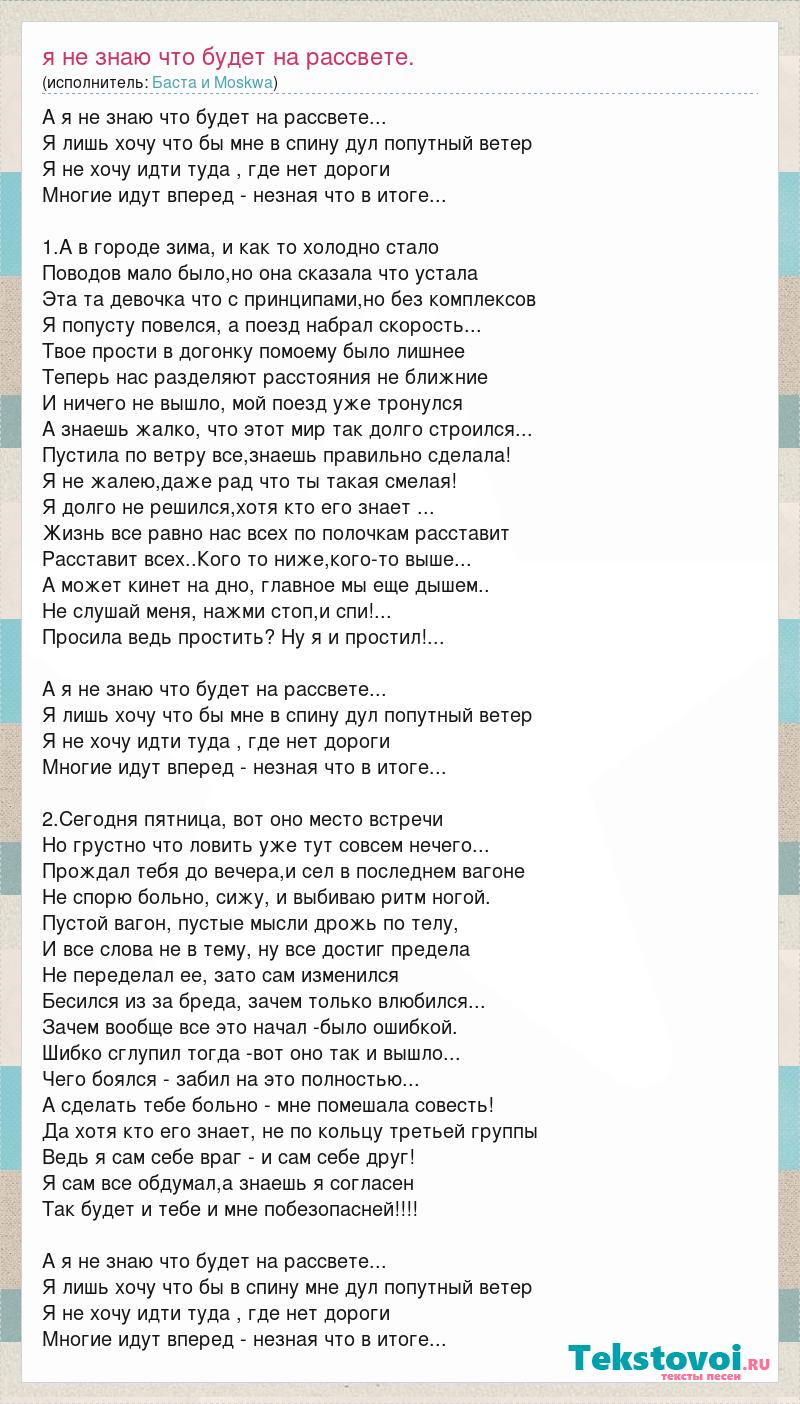 А я не знаю что будет на рассвете... Я лишь хочу что бы мне в спину дул попутный ветер Я не хочу идти туда , где нет дороги Многие идут вперед - незная что в итоге... 1.А в городе зима, и как то холодно стало Поводов мало было,но она сказала что устала Эта та девочка что с принципами,но без комплексов Я попусту повелся, а поезд набрал скорость... Твое прости в догонку помоему было лишнее Теперь нас разделяют расстояния не ближние И ничего не вышло, мой поезд уже тронулся А знаешь жалко, что этот мир так долго строился... Пустила по ветру все,знаешь правильно сделала! Я не жалею,даже рад что ты такая смелая! Я долго не решился,хотя кто его знает ... Жизнь все равно нас всех по полочкам расставит Расставит всех..Кого то ниже,кого-то выше... А может кинет на дно, главное мы еще дышем.. Не слушай меня, нажми стоп,и спи!... Просила ведь простить? Ну я и простил!... А я не знаю что будет на рассвете... Я лишь хочу что бы мне в спину дул попутный ветер Я не хочу идти туда , где нет дороги Многие идут вперед - незная что в итоге... 2.Сегодня пятница, вот оно место встречи Но грустно что ловить уже тут совсем нечего... Прождал тебя до вечера,и сел в последнем вагоне Не спорю больно, сижу, и выбиваю ритм ногой. Пустой вагон, пустые мысли дрожь по телу, И все слова не в тему, ну все достиг предела Не переделал ее, зато сам изменился Бесился из за бреда, зачем только влюбился... Зачем вообще все это начал -было ошибкой. Шибко сглупил тогда -вот оно так и вышло... Чего боялся - забил на это полностью... А сделать тебе больно - мне помешала совесть! Да хотя кто его знает, не по кольцу третьей группы Ведь я сам себе враг - и сам себе друг! Я сам все обдумал,а знаешь я согласен Так будет и тебе и мне побезопасней!!!! А я не знаю что будет на рассвете... Я лишь хочу что бы в спину мне дул попутный ветер Я не хочу идти туда , где нет дороги Многие идут вперед - незная что в итоге...
