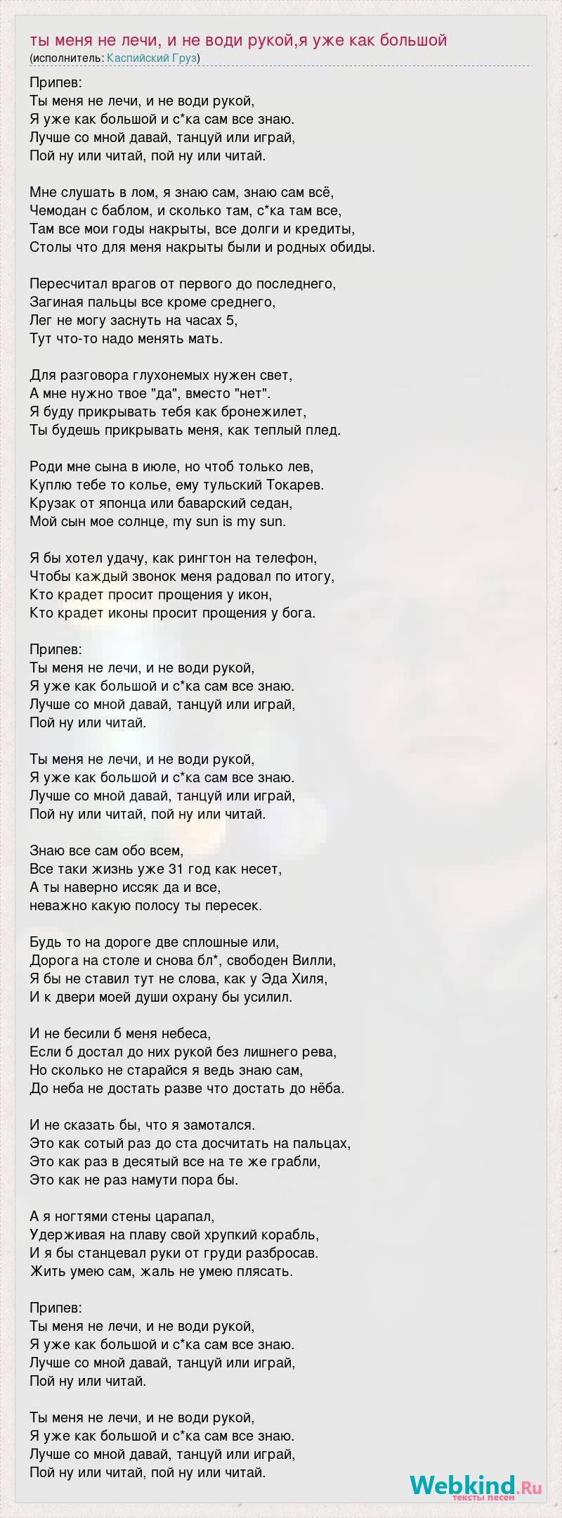 Припев: Ты меня не лечи, и не води рукой, Я уже как большой и с*ка сам все знаю. Лучше со мной давай, танцуй или играй, Пой ну или читай, пой ну или читай. Мне слушать в лом, я знаю сам, знаю сам всё, Чемодан с баблом, и сколько там, с*ка там все, Там все мои годы накрыты, все долги и кредиты, Столы что для меня накрыты были и родных обиды. Пересчитал врагов от первого до последнего, Загиная пальцы все кроме среднего, Лег не могу заснуть на часах 5, Тут что-то надо менять мать. Для разговора глухонемых нужен свет, А мне нужно твое "да", вместо "нет". Я буду прикрывать тебя как бронежилет, Ты будешь прикрывать меня, как теплый плед. Роди мне сына в июле, но чтоб только лев, Куплю тебе то колье, ему тульский Токарев. Крузак от японца или баварский седан, Мой сын мое солнце, my sun is my sun. Я бы хотел удачу, как рингтон на телефон, Чтобы каждый звонок меня радовал по итогу, Кто крадет просит прощения у икон, Кто крадет иконы просит прощения у бога. Припев: Ты меня не лечи, и не води рукой, Я уже как большой и с*ка сам все знаю. Лучше со мной давай, танцуй или играй, Пой ну или читай. Ты меня не лечи, и не води рукой, Я уже как большой и с*ка сам все знаю. Лучше со мной давай, танцуй или играй, Пой ну или читай, пой ну или читай. Знаю все сам обо всем, Все таки жизнь уже 31 год как несет, А ты наверно иссяк да и все, неважно какую полосу ты пересек. Будь то на дороге две сплошные или, Дорога на столе и снова бл*, свободен Вилли, Я бы не ставил тут не слова, как у Эда Хиля, И к двери моей души охрану бы усилил. И не бесили б меня небеса, Если б достал до них рукой без лишнего рева, Но сколько не старайся я ведь знаю сам, До неба не достать разве что достать до нёба. И не сказать бы, что я замотался. Это как сотый раз до ста досчитать на пальцах, Это как раз в десятый все на те же грабли, Это как не раз намути пора бы. А я ногтями стены царапал, Удерживая на плаву свой хрупкий корабль, И я бы станцевал руки от груди разбросав. Жить умею сам, жаль не умею плясать. Припев: Ты меня не лечи, и не води рукой, Я уже как большой и с*ка сам все знаю. Лучше со мной давай, танцуй или играй, Пой ну или читай. Ты меня не лечи, и не води рукой, Я уже как большой и с*ка сам все знаю. Лучше со мной давай, танцуй или играй, Пой ну или читай, пой ну или читай.