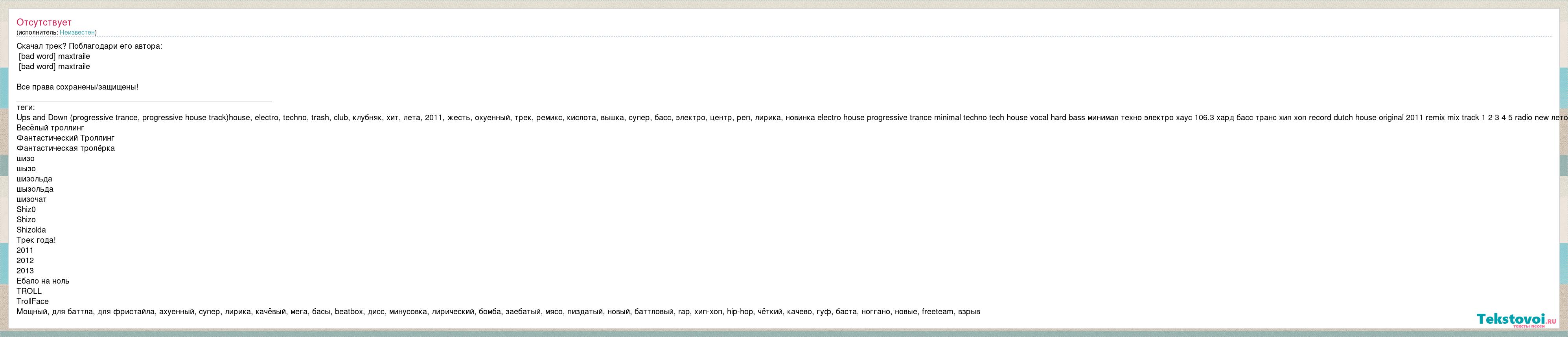 Скачал трек? Поблагодари его автора: [bad word] maxtraile [bad word] maxtraile Все права сохранены/защищены! ___________________________________________________________ теги: Ups and Down (progressive trance, progressive house track)house, electro, techno, trash, club, клубняк, хит, лета, 2011, жесть, охуенный, трек, ремикс, кислота, вышка, супер, басс, электро, центр, реп, лирика, новинка electro house progressive trance minimal techno tech house vocal hard bass минимал техно электро хаус 106.3 хард басс транс хип хоп record dutch house original 2011 remix mix track 1 2 3 4 5 radio new лето Весёлый троллинг Фантастический Троллинг Фантастическая тролёрка шизо шызо шизольда шызольда шизочат Shiz0 Shizo Shizolda Трек года! 2011 2012 2013 Ебало на ноль TROLL TrollFace Мощный, для баттла, для фристайла, ахуенный, супер, лирика, качёвый, мега, басы, beatbox, дисс, минусовка, лирический, бомба, заебатый, мясо, пиздатый, новый, баттловый, rap, хип-хоп, hip-hop, чёткий, качево, гуф, баста, ноггано, новые, freeteam, взрыв