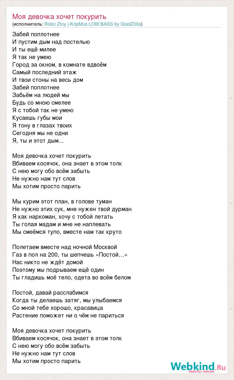 Забей поплотнее И пустим дым над постелью И ты ещё милее Я так не умею Город за окном, в комнате вдвоём Самый последний этаж И твои стоны на весь дом Забей поплотнее Забьём на людей мы Будь со мною смелее Я с тобой так не умею Кусаешь губы мои Я тону в глазах твоих Сегодня мы не одни Я, ты и этот дым... Моя девочка хочет покурить Вбиваем косячок, она знает в этом толк С нею могу обо всём забыть Не нужно нам тут слов Мы хотим просто парить Мы курим этот план, в голове туман Не нужно этих сук, мне нужен твой дурман Я как наркоман, хочу с тобой летать Ты голая мадам и мне не наплевать Мы смеёмся тупо, вместе нам так круто Полетаем вместе над ночной Москвой Газ в пол на 200, ты шепчешь «Постой…» Нас никто не ждёт домой Поэтому мы подрываем ещё один Ты гладишь моё тело, одета во всём белом Постой, давай расслабимся Когда ты делаешь затяг, мы улыбаемся Со мной тебе хорошо, красавица Растение поможет ни о чём не париться Моя девочка хочет покурить Вбиваем косячок, она знает в этом толк С нею могу обо всём забыть Не нужно нам тут слов Мы хотим просто парить