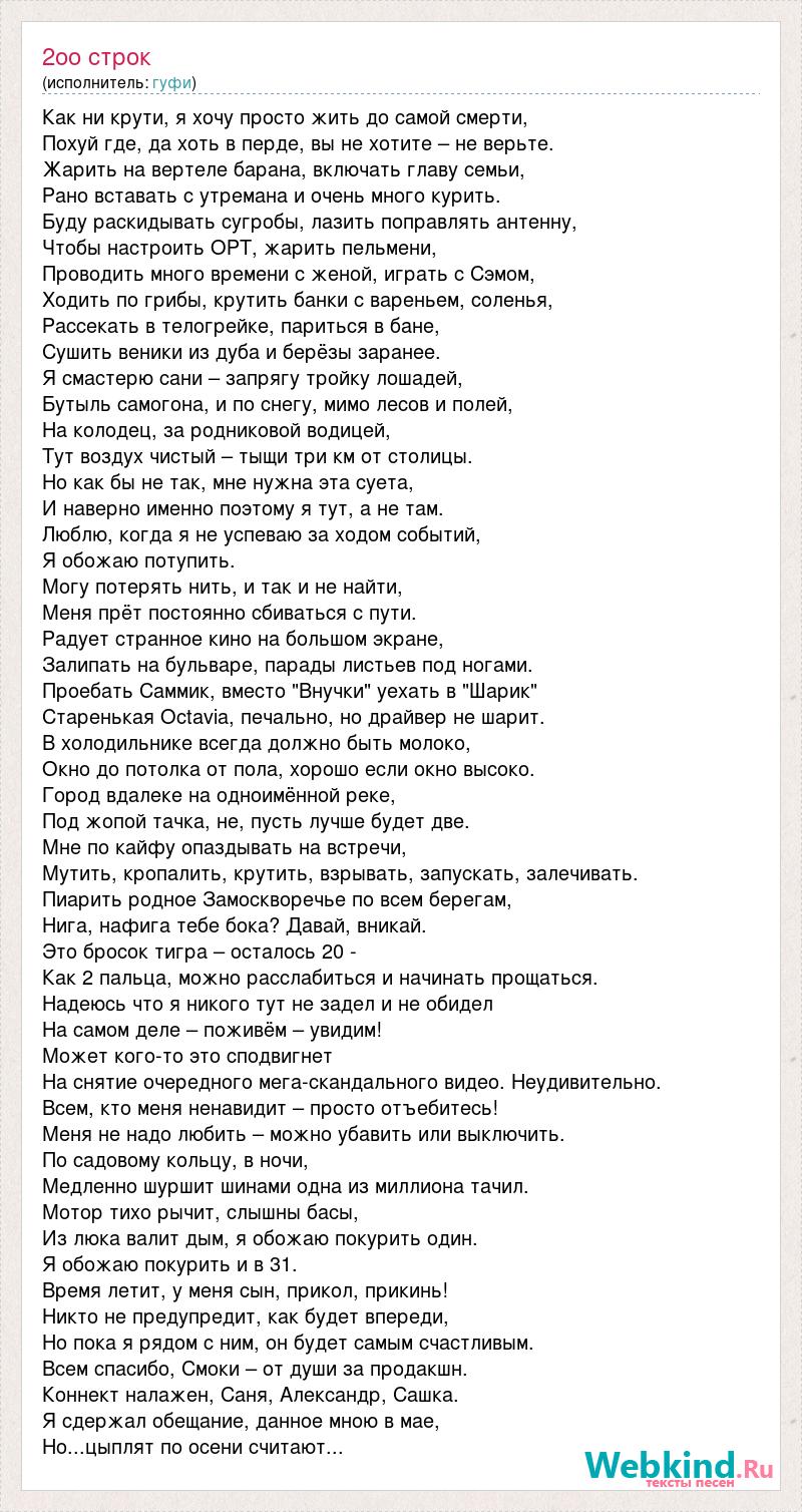 Как ни крути, я хочу просто жить до самой смерти, Похуй где, да хоть в перде, вы не хотите – не верьте. Жарить на вертеле барана, включать главу семьи, Рано вставать с утремана и очень много курить. Буду раскидывать сугробы, лазить поправлять антенну, Чтобы настроить ОРТ, жарить пельмени, Проводить много времени с женой, играть с Сэмом, Ходить по грибы, крутить банки с вареньем, соленья, Рассекать в телогрейке, париться в бане, Сушить веники из дуба и берёзы заранее. Я смастерю сани – запрягу тройку лошадей, Бутыль самогона, и по снегу, мимо лесов и полей, На колодец, за родниковой водицей, Тут воздух чистый – тыщи три км от столицы. Но как бы не так, мне нужна эта суета, И наверно именно поэтому я тут, а не там. Люблю, когда я не успеваю за ходом событий, Я обожаю потупить. Могу потерять нить, и так и не найти, Меня прёт постоянно сбиваться с пути. Радует странное кино на большом экране, Залипать на бульваре, парады листьев под ногами. Проебать Саммик, вместо "Внучки" уехать в "Шарик" Старенькая Octavia, печально, но драйвер не шарит. В холодильнике всегда должно быть молоко, Окно до потолка от пола, хорошо если окно высоко. Город вдалеке на одноимённой реке, Под жопой тачка, не, пусть лучше будет две. Мне по кайфу опаздывать на встречи, Мутить, кропалить, крутить, взрывать, запускать, залечивать. Пиарить родное Замоскворечье по всем берегам, Нига, нафига тебе бока? Давай, вникай. Это бросок тигра – осталось 20 - Как 2 пальца, можно расслабиться и начинать прощаться. Надеюсь что я никого тут не задел и не обидел На самом деле – поживём – увидим! Может кого-то это сподвигнет На снятие очередного мега-скандального видео. Неудивительно. Всем, кто меня ненавидит – просто отъебитесь! Меня не надо любить – можно убавить или выключить. По садовому кольцу, в ночи, Медленно шуршит шинами одна из миллиона тачил. Мотор тихо рычит, слышны басы, Из люка валит дым, я обожаю покурить один. Я обожаю покурить и в 31. Время летит, у меня сын, прикол, прикинь! Никто не предупредит, как будет впереди, Но пока я рядом с ним, он будет самым счастливым. Всем спасибо, Смоки – от души за продакшн. Коннект налажен, Саня, Александр, Сашка. Я сдержал обещание, данное мною в мае, Но...цыплят по осени считают...
