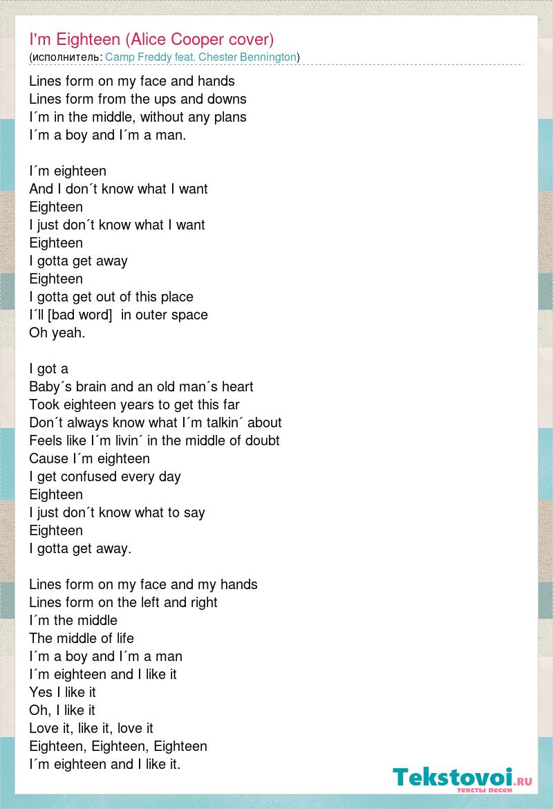 Lines form on my face and hands Lines form from the ups and downs I´m in the middle, without any plans I´m a boy and I´m a man. I´m eighteen And I don´t know what I want Eighteen I just don´t know what I want Eighteen I gotta get away Eighteen I gotta get out of this place I´ll [bad word] in outer space Oh yeah. I got a Baby´s brain and an old man´s heart Took eighteen years to get this far Don´t always know what I´m talkin´ about Feels like I´m livin´ in the middle of doubt Cause I´m eighteen I get confused every day Eighteen I just don´t know what to say Eighteen I gotta get away. Lines form on my face and my hands Lines form on the left and right I´m the middle The middle of life I´m a boy and I´m a man I´m eighteen and I like it Yes I like it Oh, I like it Love it, like it, love it Eighteen, Eighteen, Eighteen I´m eighteen and I like it.