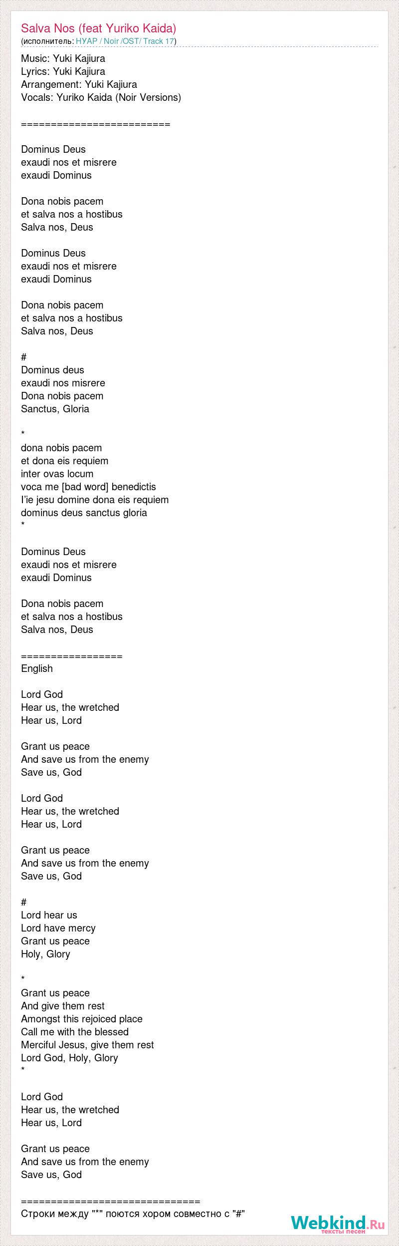 Music: Yuki Kajiura Lyrics: Yuki Kajiura Arrangement: Yuki Kajiura Vocals: Yuriko Kaida (Noir Versions) ========================= Dominus Deus exaudi nos et misrere exaudi Dominus Dona nobis pacem et salva nos a hostibus Salva nos, Deus Dominus Deus exaudi nos et misrere exaudi Dominus Dona nobis pacem et salva nos a hostibus Salva nos, Deus # Dominus deus exaudi nos misrere Dona nobis pacem Sanctus, Gloria * dona nobis pacem et dona eis requiem inter ovas locum voca me [bad word] benedictis I’ie jesu domine dona eis requiem dominus deus sanctus gloria * Dominus Deus exaudi nos et misrere exaudi Dominus Dona nobis pacem et salva nos a hostibus Salva nos, Deus ================= English Lord God Hear us, the wretched Hear us, Lord Grant us peace And save us from the enemy Save us, God Lord God Hear us, the wretched Hear us, Lord Grant us peace And save us from the enemy Save us, God # Lord hear us Lord have mercy Grant us peace Holy, Glory * Grant us peace And give them rest Amongst this rejoiced place Call me with the blessed Merciful Jesus, give them rest Lord God, Holy, Glory * Lord God Hear us, the wretched Hear us, Lord Grant us peace And save us from the enemy Save us, God ============================== Строки между "*" поются хором совместно с "#"