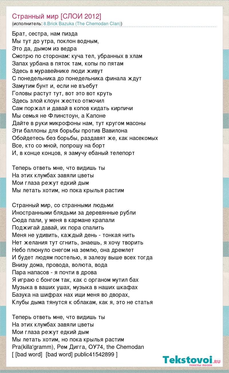 Брат, сестра, нам пизда Мы тут до утра, поклон водным, Это да, дымом из ведра Смотрю по сторонам: куча тел, убранных в хлам Запах урбана в пяток там, копы по пятам Здесь в муравейнике люди живут С понедельника до понедельника финала ждут Замутим бунт и, если не въебут Головы растут тут, вот это вот круть Здесь злой клоун жестко отмочил Сам поржал и давай в копов кидать кирпичи Мы семья не Флинстоун, а Капоне Дайте в руки микрофоны нам, тут кругом масоны Эти баллоны для борьбы против Вавилона Обойдетесь без борьбы, раздавят же, как насекомых Все, кто со мной, попрошу на борт И, в конце концов, я замучу ебаный телепорт Теперь ответь мне, что видишь ты На этих клумбах завяли цветы Мои глаза режут едкий дым Мы летать хотим, но пока крылья растим Странный мир, со странными людьми Иностранными блядьми за деревянные рубли Сюда пали, у меня в кармане крапали Поджигай давай, их пора спалить Меня не удивить, каждый день - тонкая нить Нет желания тут сгнить, знаешь, я хочу творить Небо плюнуло снегом на землю, она дремлет И будет людям постелью, я залезу выше всех тогда Внизу дома, провода, волюта, вода Пара напасов - я почти в дрова Я играю с бонгом так, как с органом мутил бах Музыка в ваших ушах, музыка в наших шкафах Базука на шифрах нах ищи меня во дворах, Клубы дыма тянутся к облакам, как я, это не статья Теперь ответь мне, что видишь ты На этих клумбах завяли цветы Мои глаза режут едкий дым Мы летать хотим, но пока крылья растим Pra(killa'gramm), Рем Дигга, ОУ74, the Chemodan [ [bad word] [bad word] public41542899 ]
