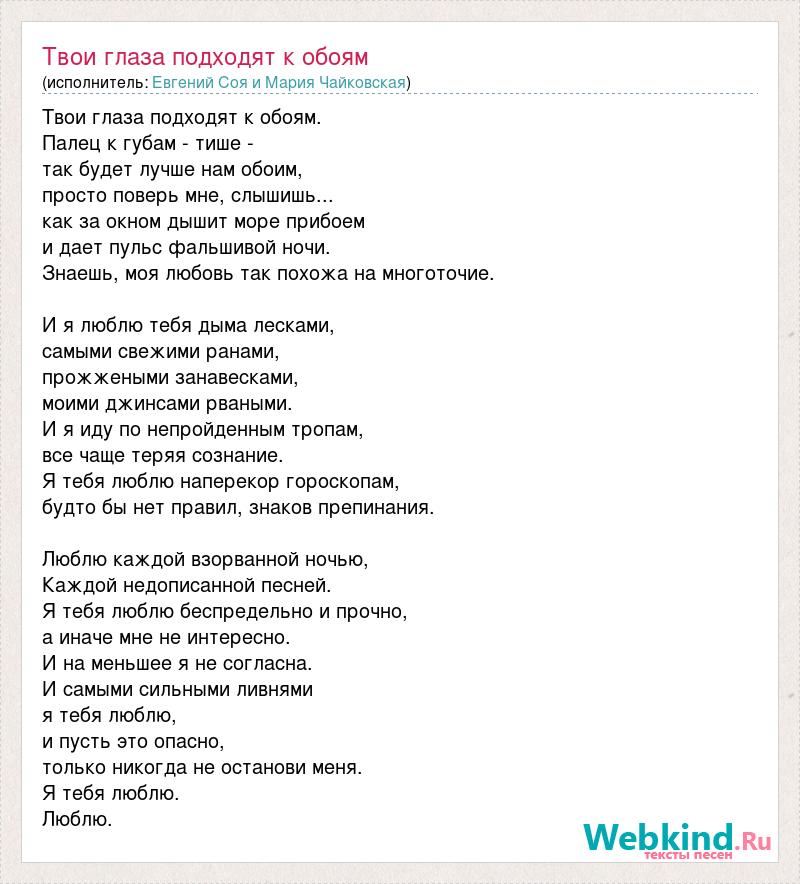 Твои глаза подходят к обоям. Палец к губам - тише - так будет лучше нам обоим, просто поверь мне, слышишь... как за окном дышит море прибоем и дает пульс фальшивой ночи. Знаешь, моя любовь так похожа на многоточие. И я люблю тебя дыма лесками, самыми свежими ранами, прожжеными занавесками, моими джинсами рваными. И я иду по непройденным тропам, все чаще теряя сознание. Я тебя люблю наперекор гороскопам, будто бы нет правил, знаков препинания. Люблю каждой взорванной ночью, Каждой недописанной песней. Я тебя люблю беспредельно и прочно, а иначе мне не интересно. И на меньшее я не согласна. И самыми сильными ливнями я тебя люблю, и пусть это опасно, только никогда не останови меня. Я тебя люблю. Люблю.