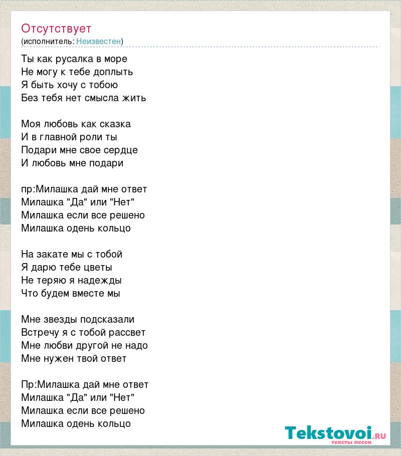 Ты как русалка в море Не могу к тебе доплыть Я быть хочу с тобою Без тебя нет смысла жить Моя любовь как сказка И в главной роли ты Подари мне свое сердце И любовь мне подари пр:Милашка дай мне ответ Милашка "Да" или "Нет" Милашка если все решено Милашка одень кольцо На закате мы с тобой Я дарю тебе цветы Не теряю я надежды Что будем вместе мы Мне звезды подсказали Встречу я с тобой рассвет Мне любви другой не надо Мне нужен твой ответ Пр:Милашка дай мне ответ Милашка "Да" или "Нет" Милашка если все решено Милашка одень кольцо