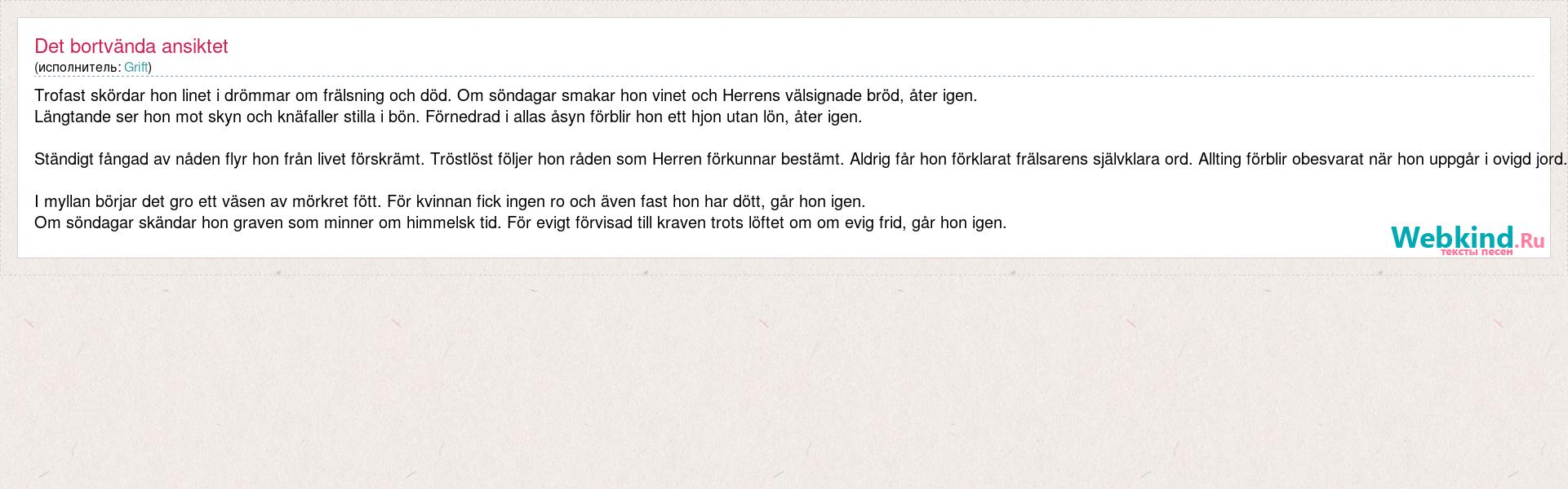Trofast skördar hon linet i drömmar om frälsning och död. Om söndagar smakar hon vinet och Herrens välsignade bröd, åter igen. Längtande ser hon mot skyn och knäfaller stilla i bön. Förnedrad i allas åsyn förblir hon ett hjon utan lön, åter igen. Ständigt fångad av nåden flyr hon från livet förskrämt. Tröstlöst följer hon råden som Herren förkunnar bestämt. Aldrig får hon förklarat frälsarens självklara ord. Allting förblir obesvarat när hon uppgår i ovigd jord. I myllan börjar det gro ett väsen av mörkret fött. För kvinnan fick ingen ro och även fast hon har dött, går hon igen. Om söndagar skändar hon graven som minner om himmelsk tid. För evigt förvisad till kraven trots löftet om om evig frid, går hon igen.