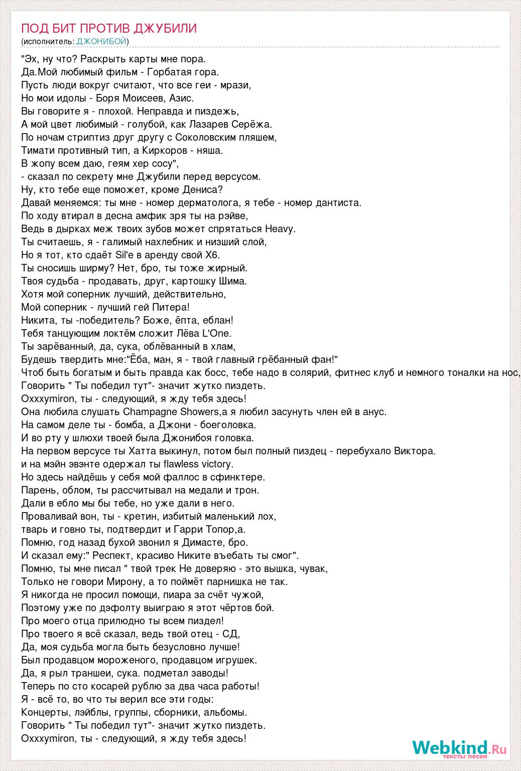 "Эх, ну что? Раскрыть карты мне пора. Да.Мой любимый фильм - Горбатая гора. Пусть люди вокруг считают, что все геи - мрази, Но мои идолы - Боря Моисеев, Азис. Вы говорите я - плохой. Неправда и пиздежь, А мой цвет любимый - голубой, как Лазарев Серёжа. По ночам стриптиз друг другу с Соколовским пляшем, Тимати противный тип, а Киркоров - няша. В жопу всем даю, геям хер сосу", - сказал по секрету мне Джубили перед версусом. Ну, кто тебе еще поможет, кроме Дениса? Давай меняемся: ты мне - номер дерматолога, я тебе - номер дантиста. По ходу втирал в десна амфик зря ты на рэйве, Ведь в дырках меж твоих зубов может спрятаться Heavy. Ты считаешь, я - галимый нахлебник и низший слой, Но я тот, кто сдаёт Sil'е в аренду свой Х6. Ты сносишь ширму? Нет, бро, ты тоже жирный. Твоя судьба - продавать, друг, картошку Шима. Хотя мой соперник лучший, действительно, Мой соперник - лучший гей Питера! Никита, ты -победитель? Боже, ёпта, еблан! Тебя танцующим локтём сложит Лёва L'One. Ты зарёванный, да, сука, облёванный в хлам, Будешь твердить мне:"Ёба, ман, я - твой главный грёбанный фан!" Чтоб быть богатым и быть правда как босс, тебе надо в солярий, фитнес клуб и немного тоналки на нос, Говорить " Ты победил тут"- значит жутко пиздеть. Oxxxymiron, ты - следующий, я жду тебя здесь! Она любила слушать Champagne Showers,а я любил засунуть член ей в анус. На самом деле ты - бомба, а Джони - боеголовка. И во рту у шлюхи твоей была Джонибоя головка. На первом версусе ты Хатта выкинул, потом был полный пиздец - перебухало Виктора. и на мэйн эвэнте одержал ты flawless victory. Но здесь найдёшь у себя мой фаллос в сфинктере. Парень, облом, ты рассчитывал на медали и трон. Дали в ебло мы бы тебе, но уже дали в него. Проваливай вон, ты - кретин, избитый маленький лох, тварь и говно ты, подтвердит и Гарри Топор,а. Помню, год назад бухой звонил я Димасте, бро. И сказал ему:" Респект, красиво Никите въебать ты смог". Помню, ты мне писал " твой трек Не доверяю - это вышка, чувак, Только не говори Мирону, а то поймёт парнишка не так. Я никогда не просил помощи, пиара за счёт чужой, Поэтому уже по дэфолту выиграю я этот чёртов бой. Про моего отца прилюдно ты всем пиздел! Про твоего я всё сказал, ведь твой отец - СД, Да, моя судьба могла быть безусловно лучше! Был продавцом мороженого, продавцом игрушек. Да, я рыл траншеи, сука. подметал заводы! Теперь по сто косарей рублю за два часа работы! Я - всё то, во что ты верил все эти годы: Концерты, лэйблы, группы, сборники, альбомы. Говорить " Ты победил тут"- значит жутко пиздеть. Oxxxymiron, ты - следующий, я жду тебя здесь!