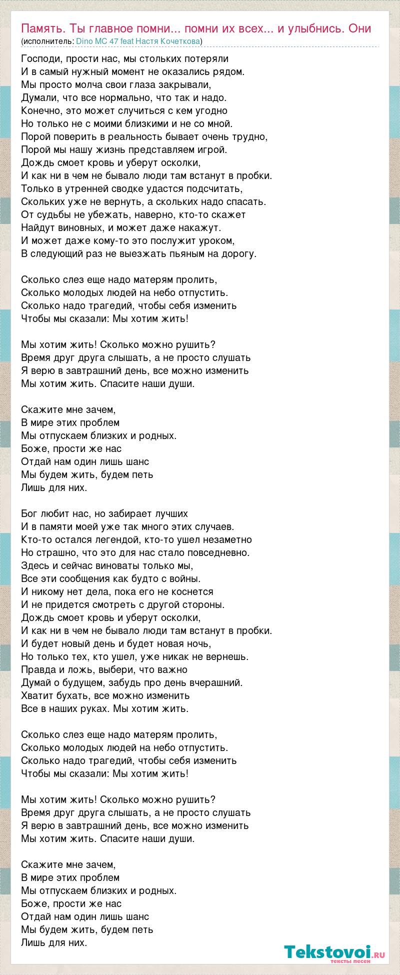 Главная→Исполнители→Dino MC 47 feat Настя Кочеткова→Память. Ты главное помни... помни их всех... и улыбнись. Они всегда рядом с