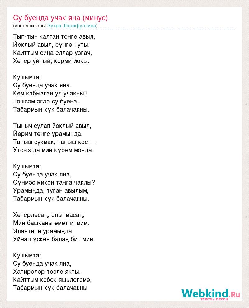 Тып-тын калган төнге авыл, Йоклый авыл, сүнгән уты. Кайттым сиңа еллар узгач, Хәтер уйный, керми йокы. Кушымта: Су буенда учак яна. Кем кабызган ул учакны? Төшсәм әгәр су буена, Табармын күк балачакны. Тыныч сулап йоклый авыл, Йөрим төнге урамында. Таныш сукмак, таныш кое — Утсыз да мин күрәм монда. Кушымта: Су буенда учак яна, Сүнмәс микән таңга чаклы? Урамыңда, туган авылым, Табармын күк балачакны. Хәтерләсәң, онытмасаң, Мин башканы өмет итмим. Ялантәпи урамыңда Уйнап үскен балаң бит мин. Кушымта: Су буенда учак яна, Хатирәләр төсле якты. Кайттым кебек яшьлегемә, Табармын күк балачакны