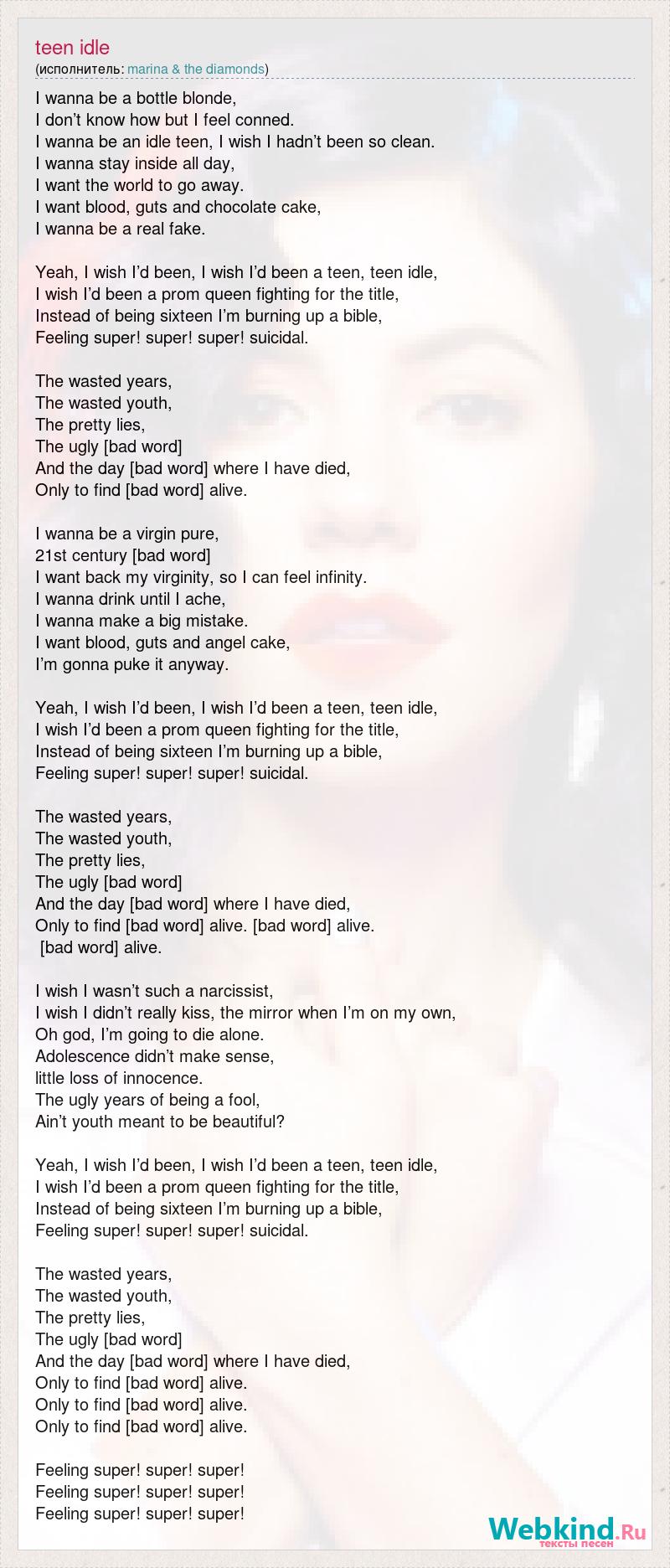 I wanna be a bottle blonde, I don’t know how but I feel conned. I wanna be an idle teen, I wish I hadn’t been so clean. I wanna stay inside all day, I want the world to go away. I want blood, guts and chocolate cake, I wanna be a real fake. Yeah, I wish I’d been, I wish I’d been a teen, teen idle, I wish I’d been a prom queen fighting for the title, Instead of being sixteen I’m burning up a bible, Feeling super! super! super! suicidal. The wasted years, The wasted youth, The pretty lies, The ugly [bad word] And the day [bad word] where I have died, Only to find [bad word] alive. I wanna be a virgin pure, 21st century [bad word] I want back my virginity, so I can feel infinity. I wanna drink until I ache, I wanna make a big mistake. I want blood, guts and angel cake, I’m gonna puke it anyway. Yeah, I wish I’d been, I wish I’d been a teen, teen idle, I wish I’d been a prom queen fighting for the title, Instead of being sixteen I’m burning up a bible, Feeling super! super! super! suicidal. The wasted years, The wasted youth, The pretty lies, The ugly [bad word] And the day [bad word] where I have died, Only to find [bad word] alive. [bad word] alive. [bad word] alive. I wish I wasn’t such a narcissist, I wish I didn’t really kiss, the mirror when I’m on my own, Oh god, I’m going to die alone. Adolescence didn’t make sense, little loss of innocence. The ugly years of being a fool, Ain’t youth meant to be beautiful? Yeah, I wish I’d been, I wish I’d been a teen, teen idle, I wish I’d been a prom queen fighting for the title, Instead of being sixteen I’m burning up a bible, Feeling super! super! super! suicidal. The wasted years, The wasted youth, The pretty lies, The ugly [bad word] And the day [bad word] where I have died, Only to find [bad word] alive. Only to find [bad word] alive. Only to find [bad word] alive. Feeling super! super! super! Feeling super! super! super! Feeling super! super! super!
